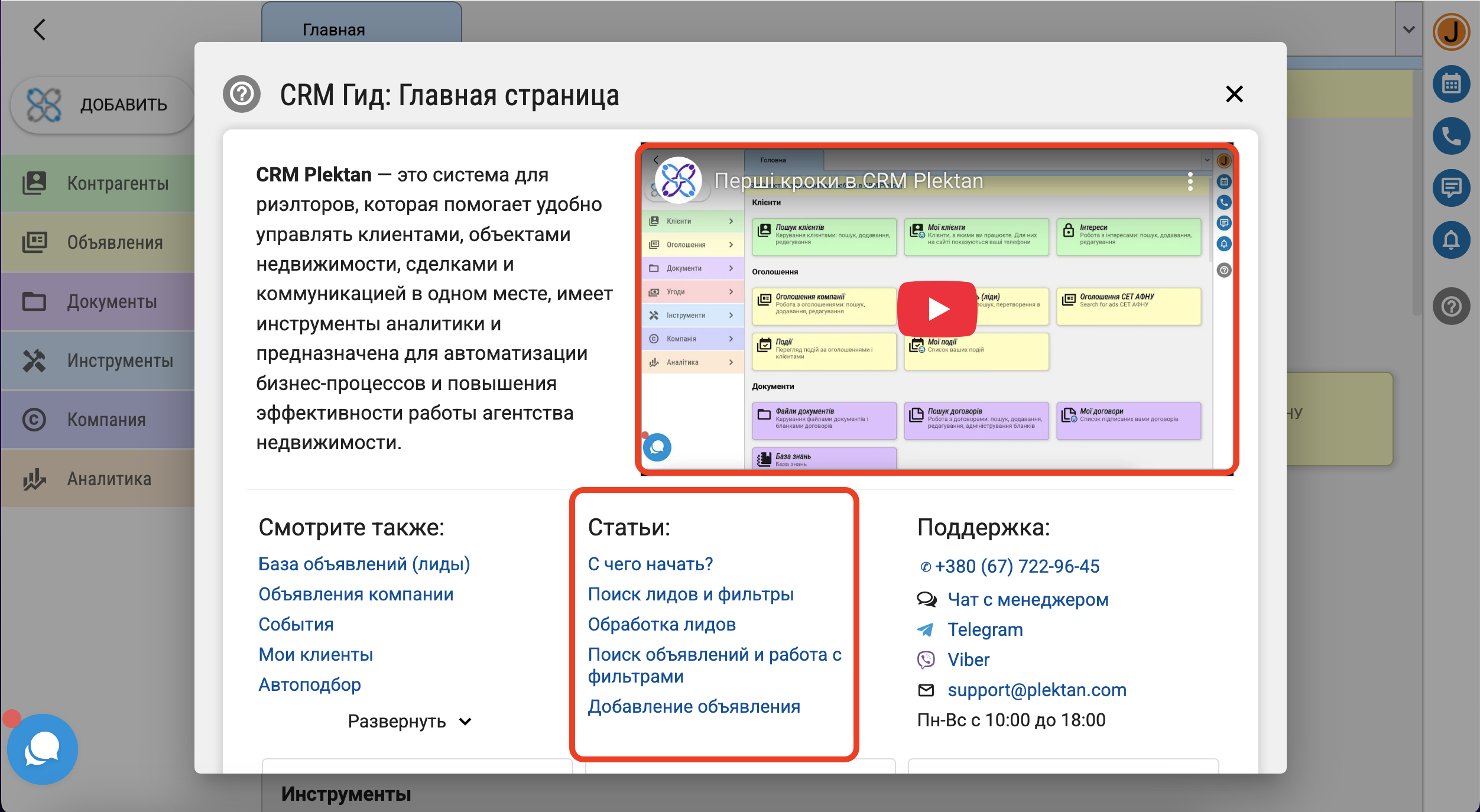 К каждому из видео добавлены Статьи с более подробной информацией по указанному функционалу CRM. Чтобы ознакомиться с текстом просто нажмите название соответствующей статьи.
