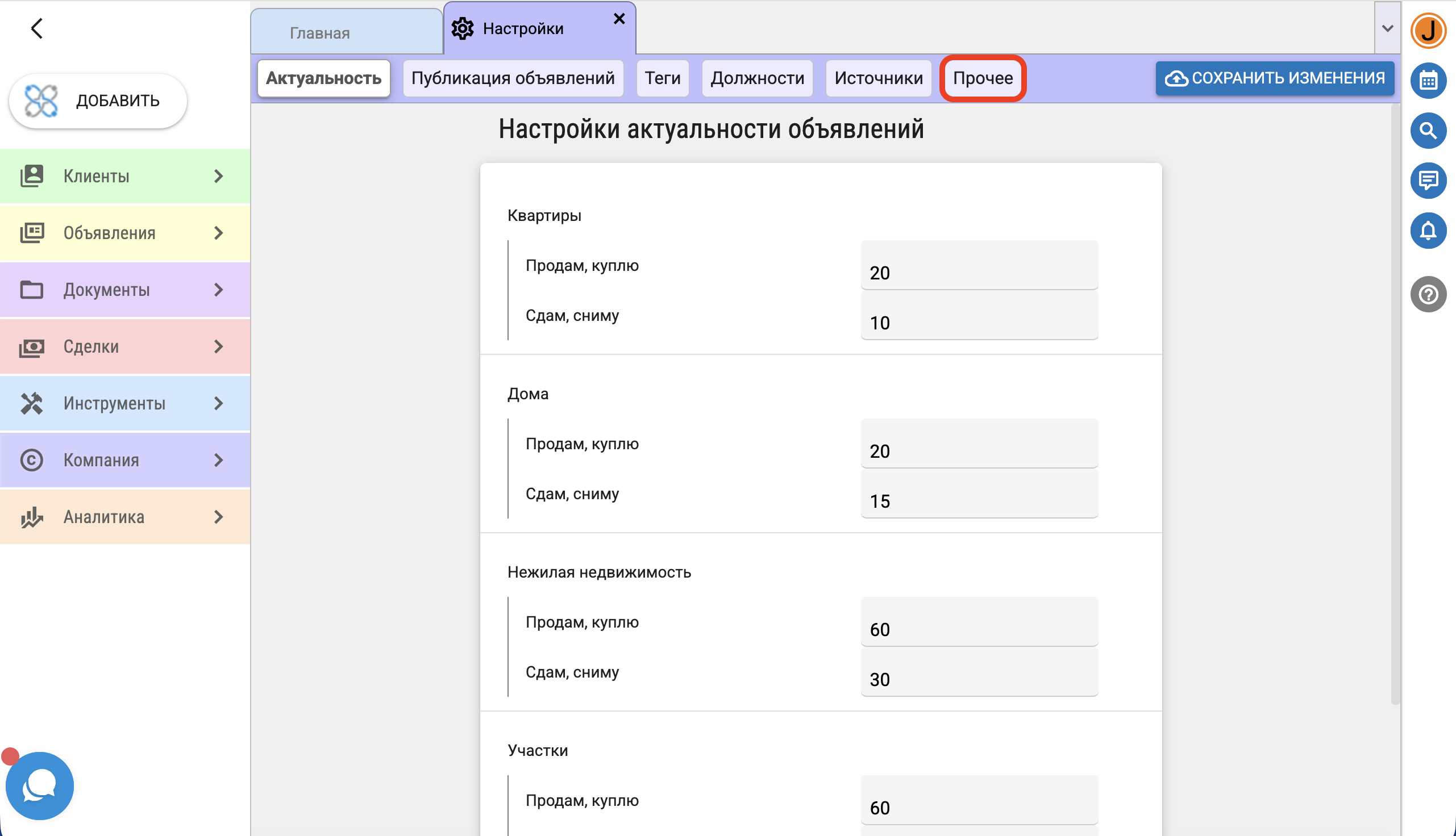 Автоматически откроется окно "Настройки"- "Актуальность". Нажмите "Прочее" и