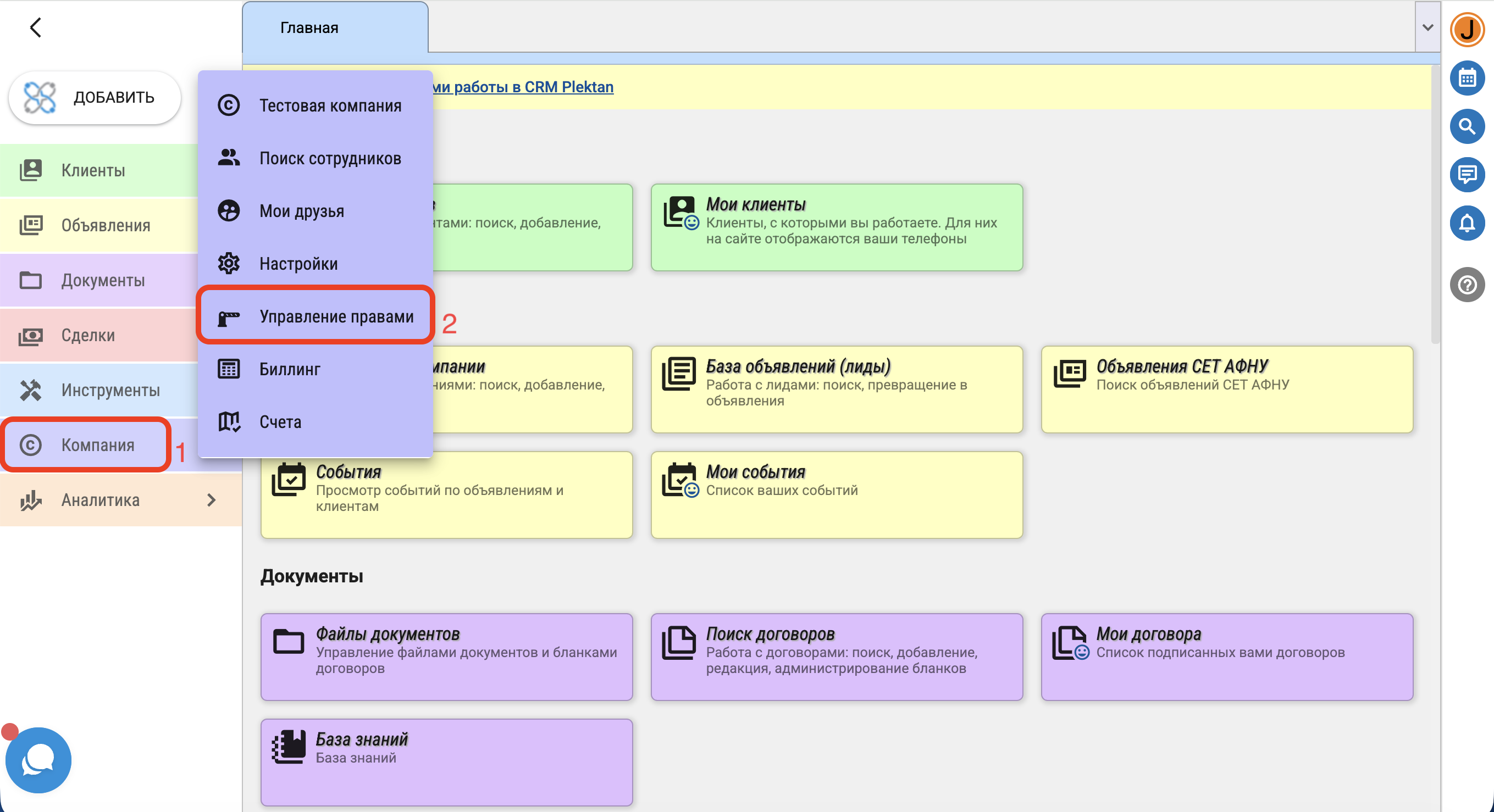 Для настройки прав доступа сотрудников компании к различным модулям и функциям выберите в меню"Компания" - "Управление правами".