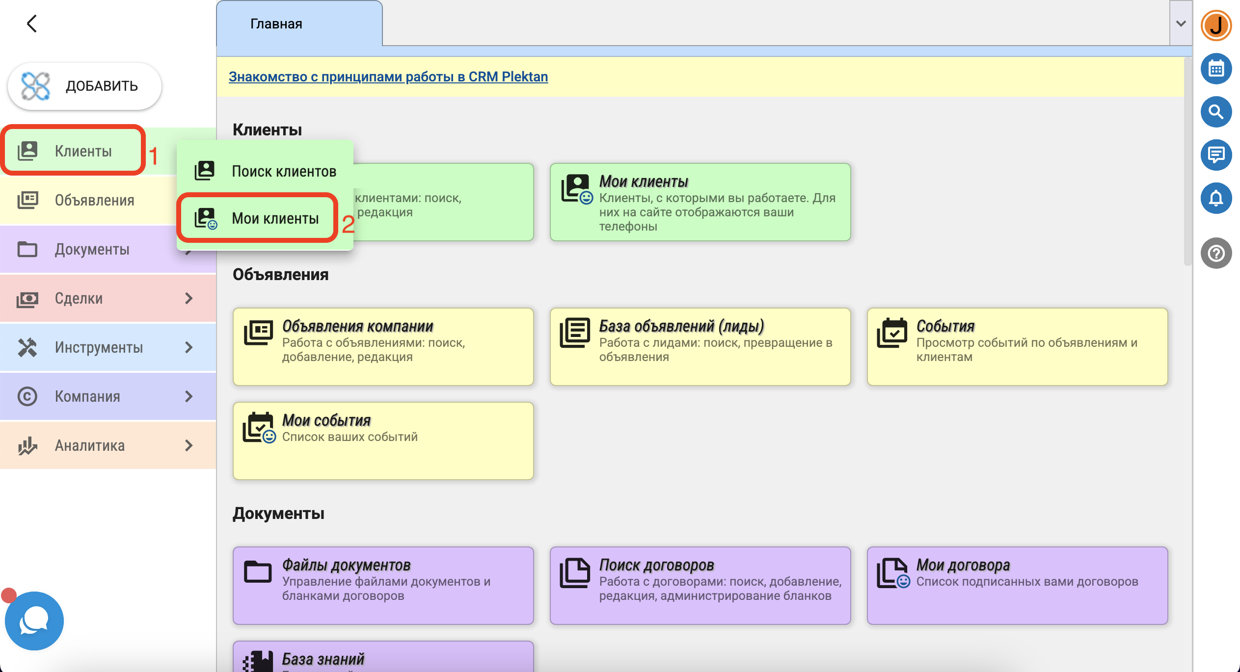 Чтобы перейти к списку "Мои клиенты" нажмите в меню "Клиенты" - "Мои клиенты".