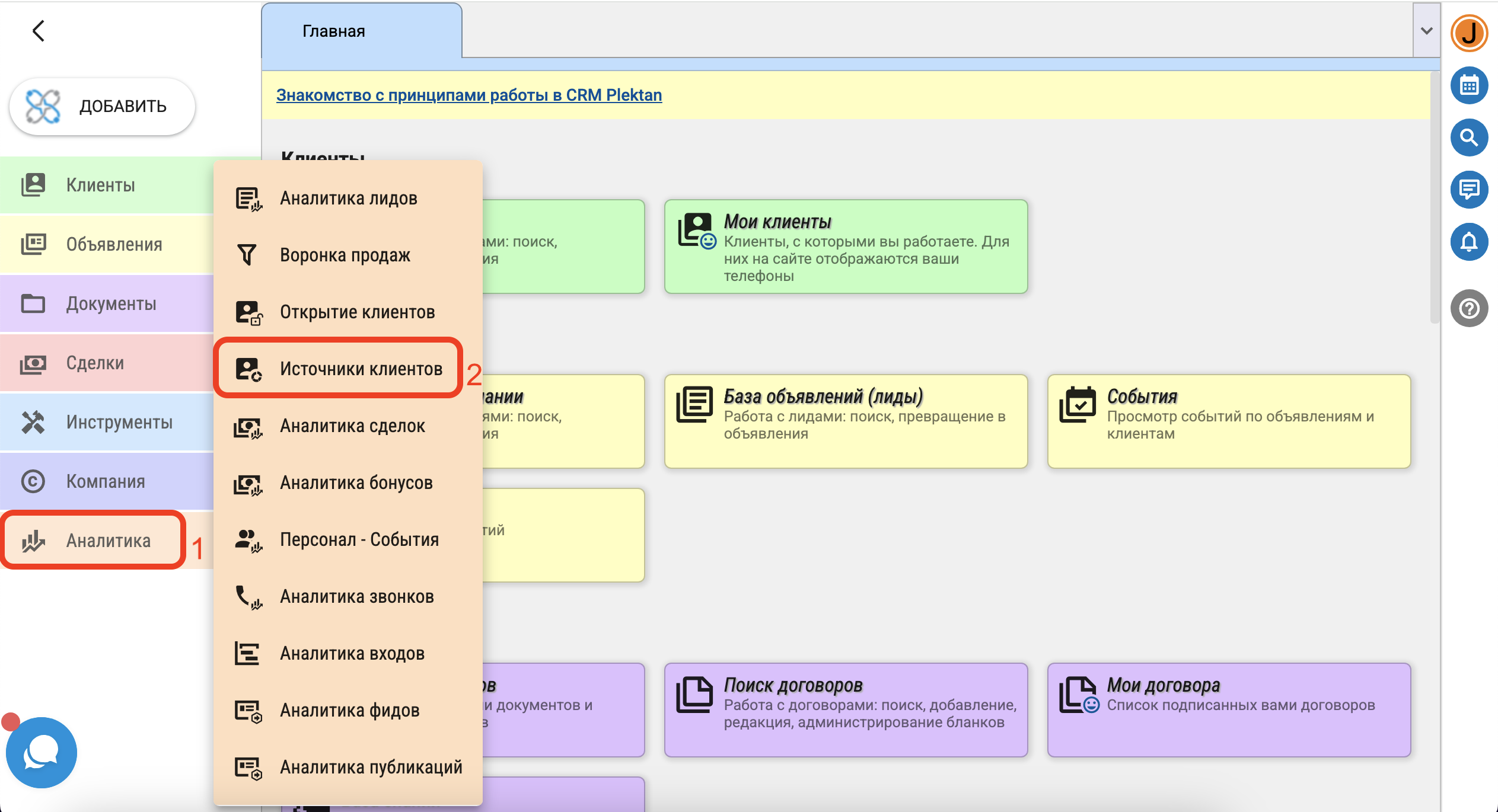 Чтобы просмотреть статистику источников ваших клиентов, нажмите в меню "Аналитика" - "Источники клиентов".