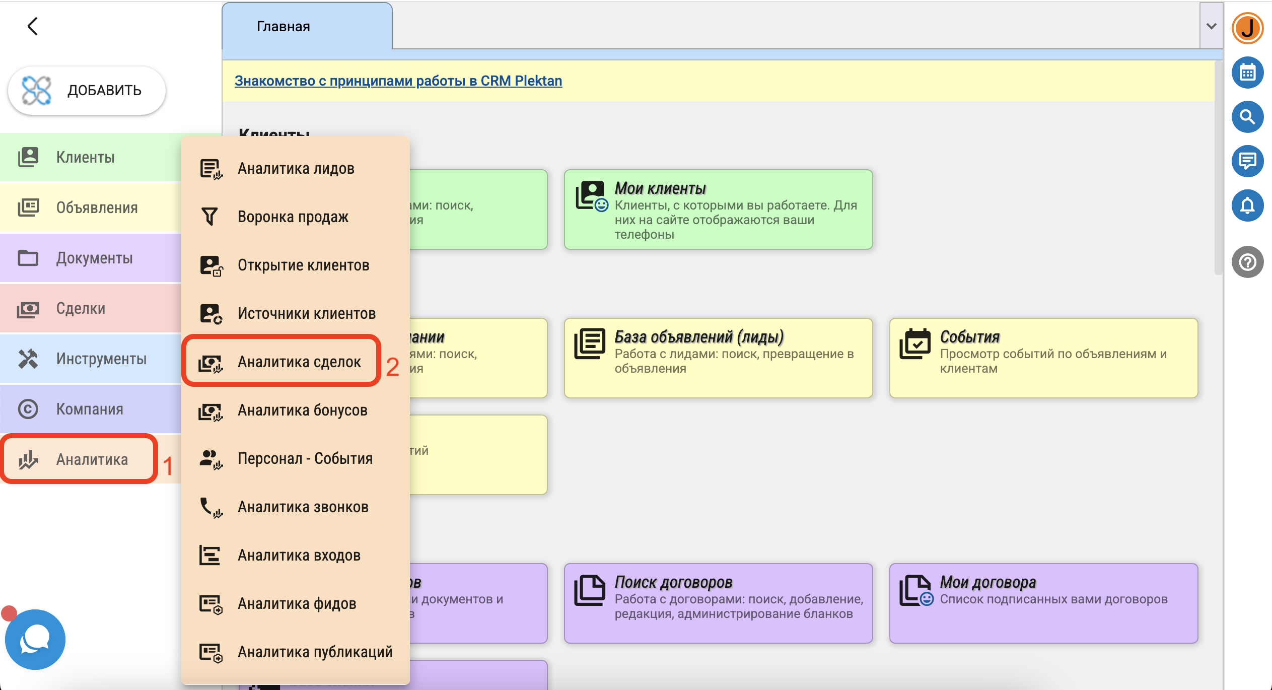 Для просмотра статистики по доходности сделок вашей компании нажмите в меню "Аналитика" - "Аналитика сделок".