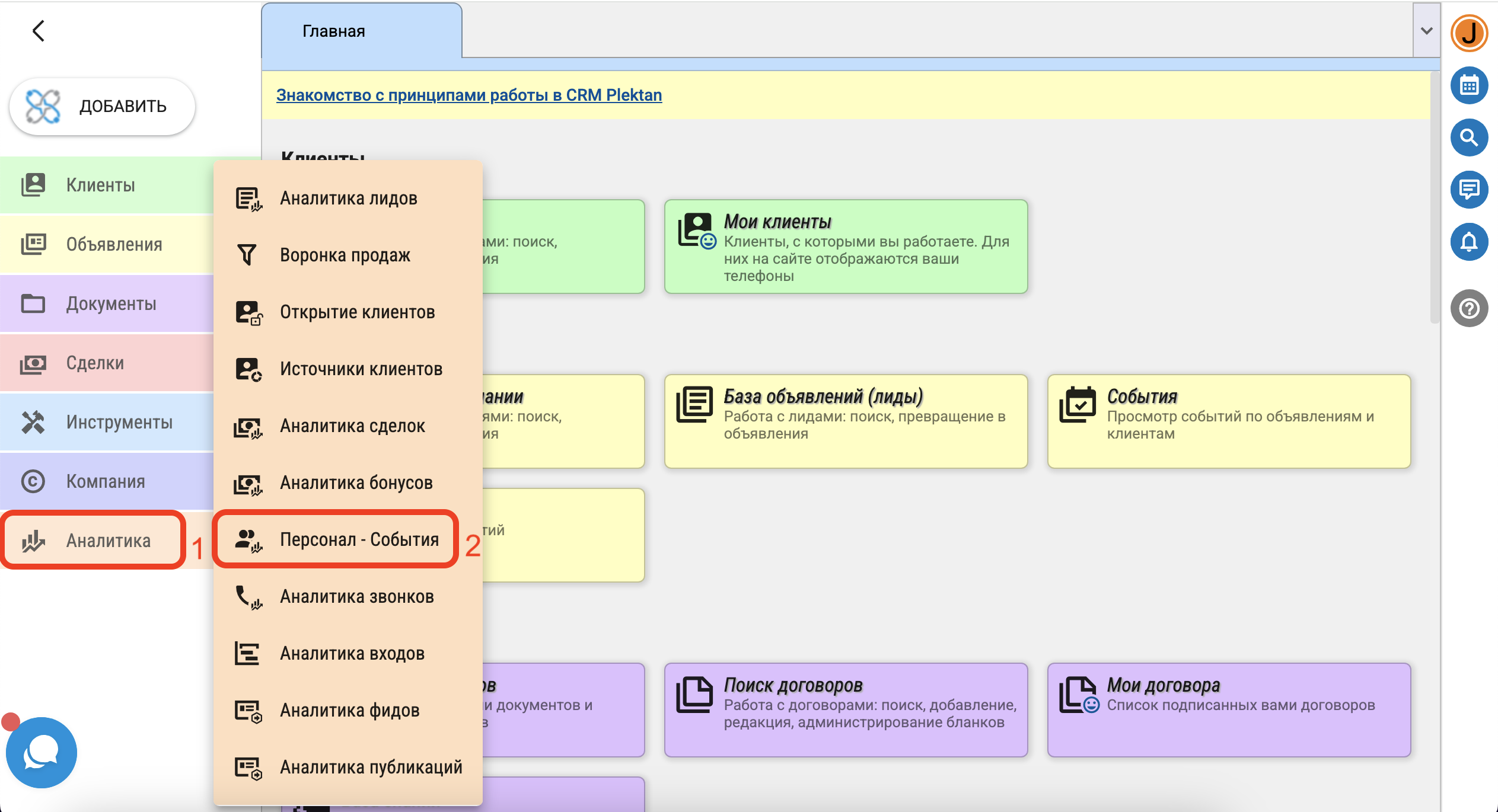 Чтобы просмотреть статистику событий в CRM, выполненных сотрудниками и подразделениями компании, нажмите в меню "Аналитика" - "Персонал - События".