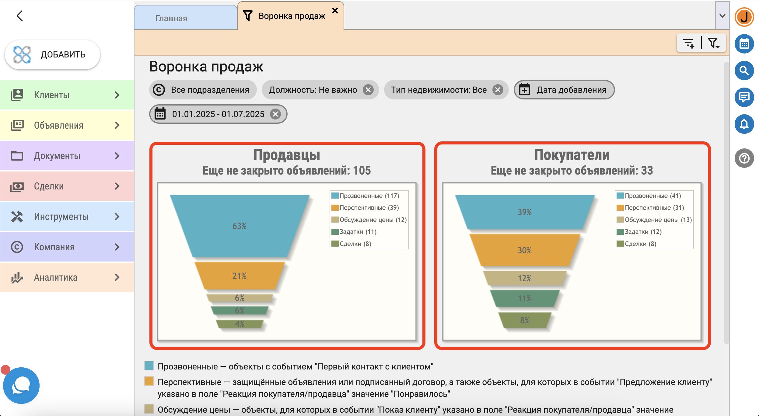 - перспективные ー защищенные объявления или с подписанным договором, а также объекты для которых в событии "Предложение клиенту" в поле "Реакция покупателя/продавца" указано "Понравилось"