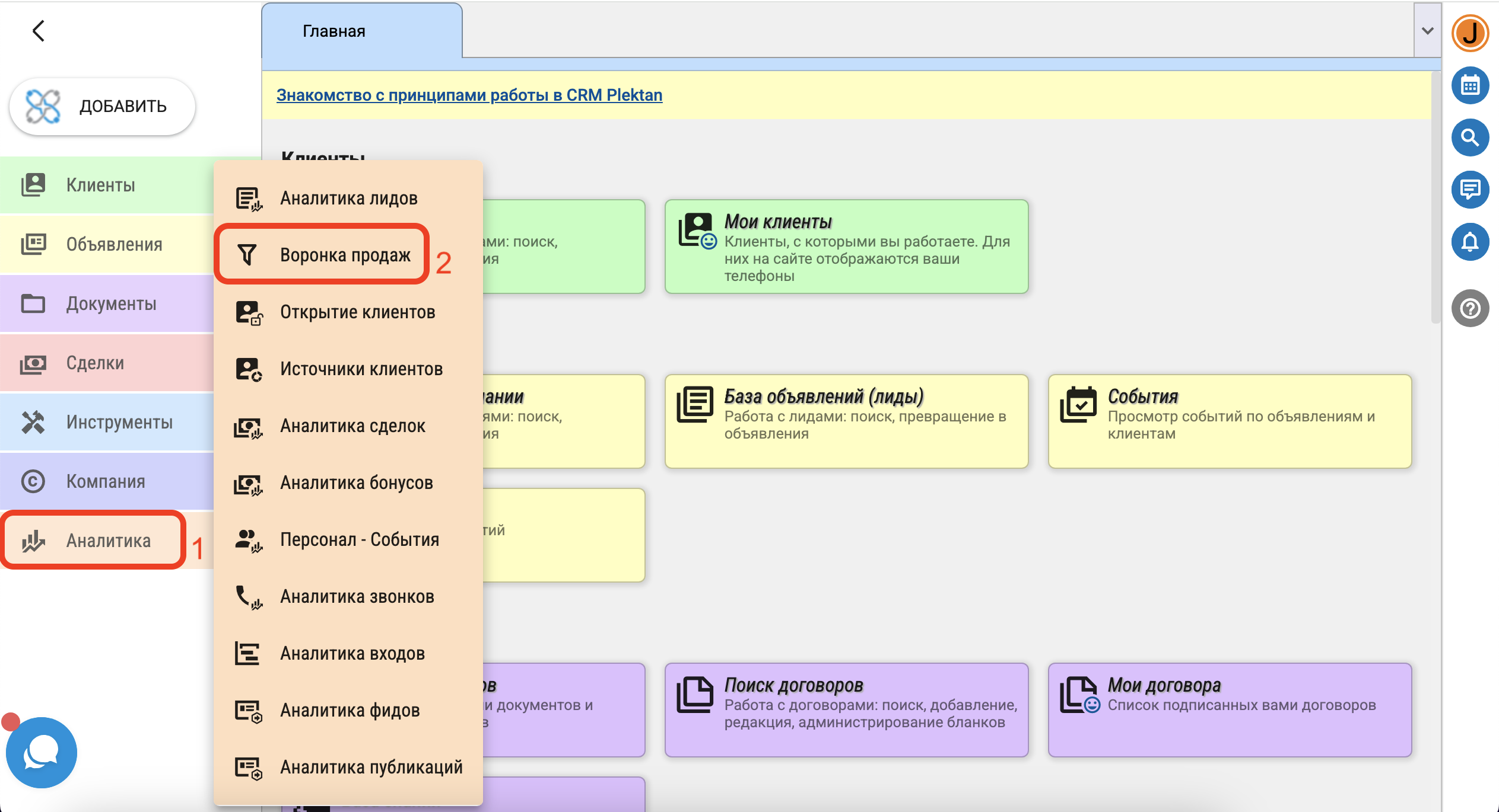 Чтобы перейти к "Воронке продаж" нажмите в меню "Аналитика" - "Воронка продаж".
