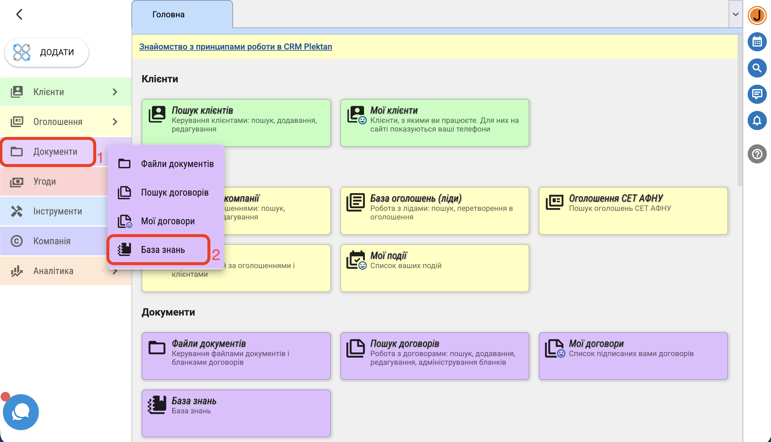 Щоб перейти до модуля "База знань" натисніть в меню "Документи" - "База знань".