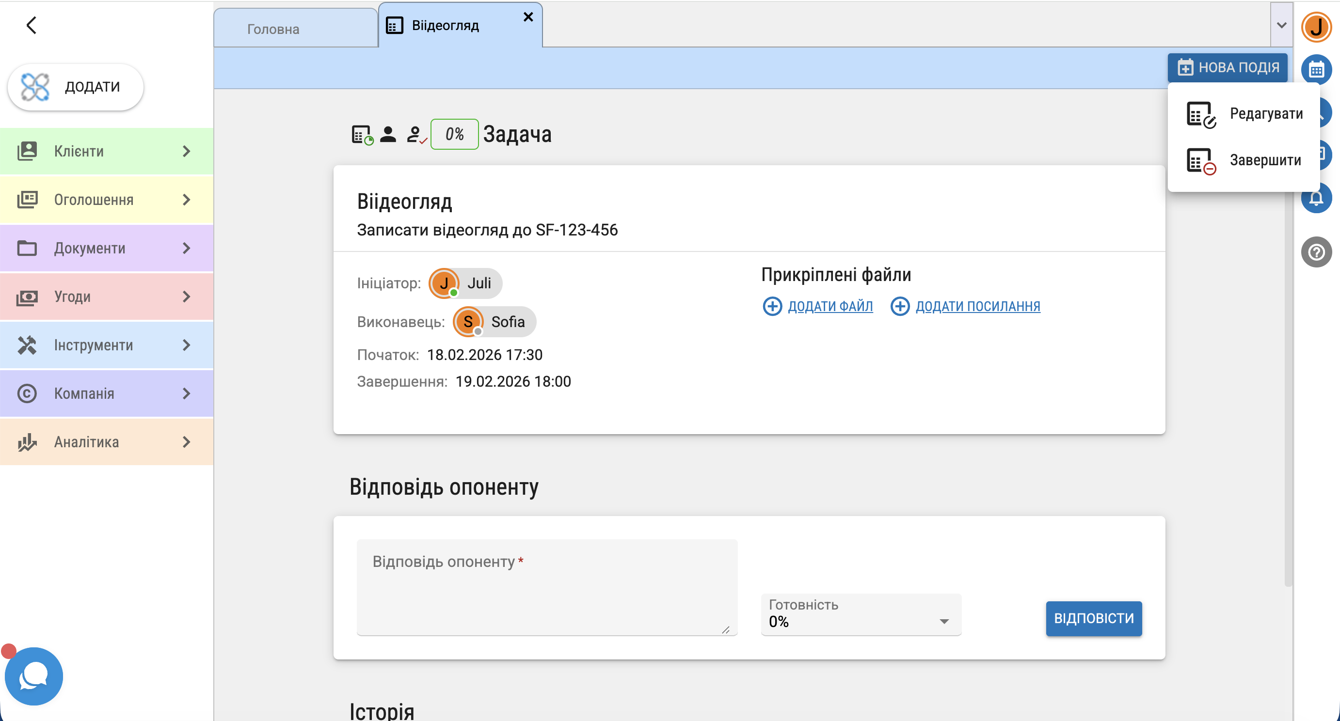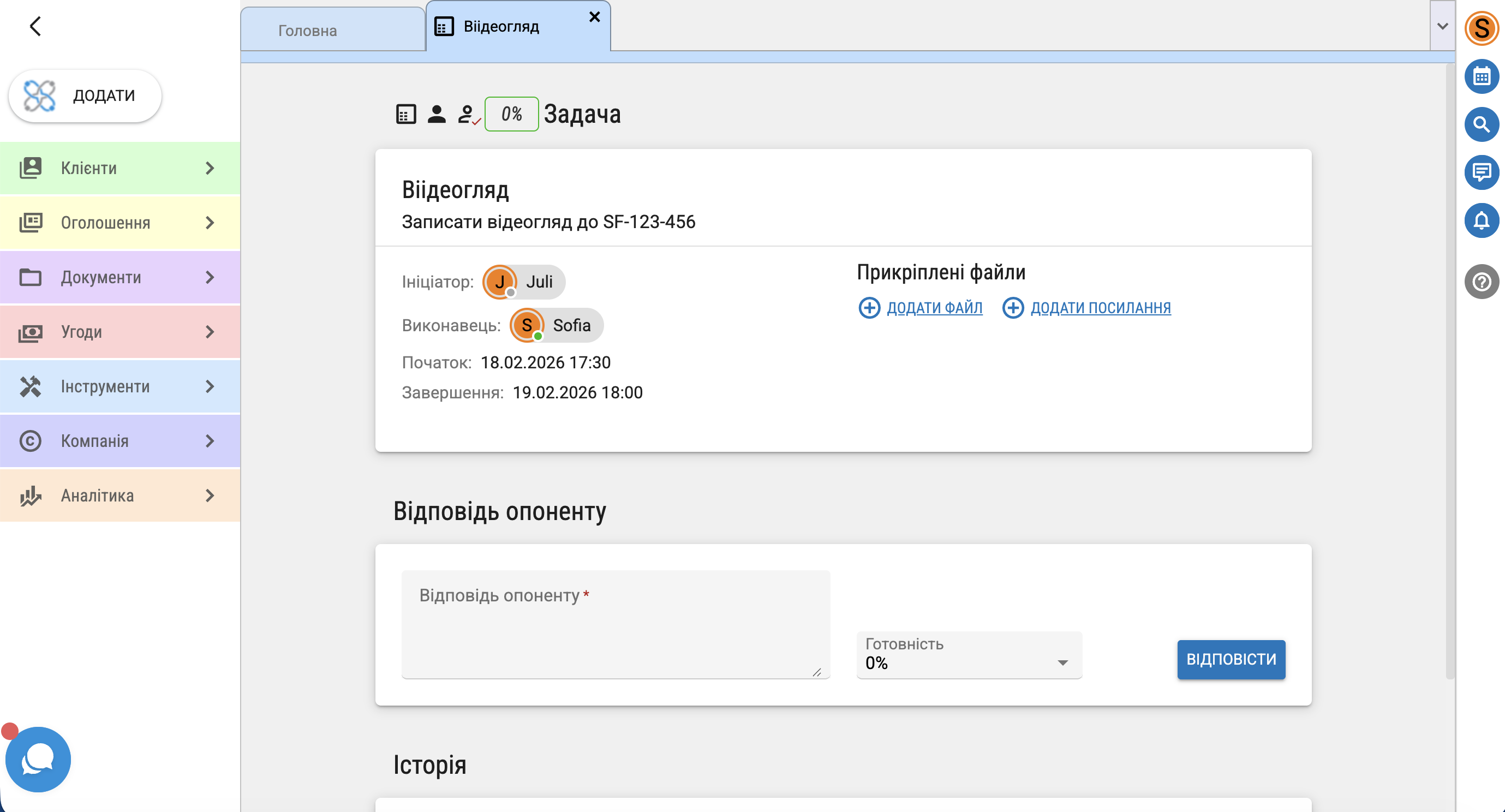 відкриється сторінка "Задача детально", на якій ініціатор задачі зможе додавати файли та посилання, писати відповідь опоненту, зазначати відсоток готовності, а також редагувати й завершувати задачу.