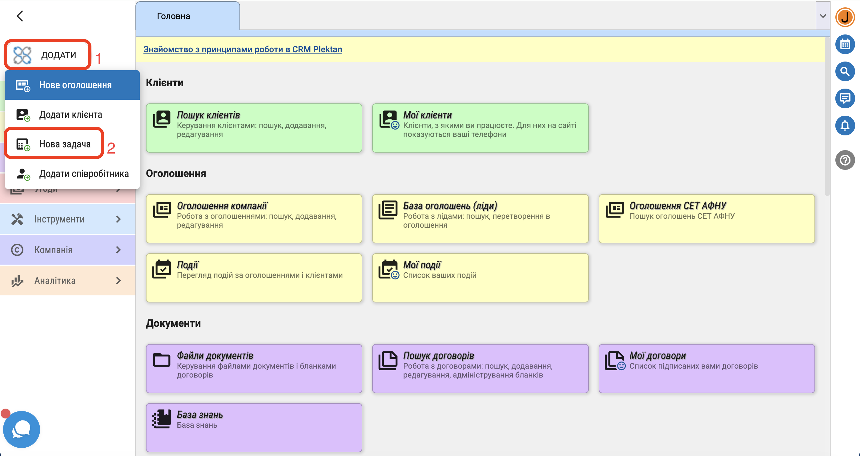 Щоб додати задачу натисніть в меню "Додати" - "Нова задача".