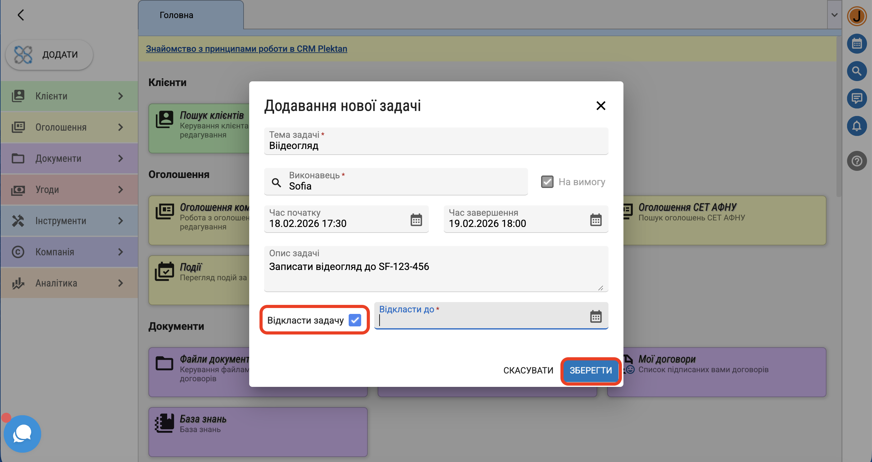 Якщо задачу необхідно відкласти на певний період поставте галочку в полі "Відкласти задачу" та виберіть дату.