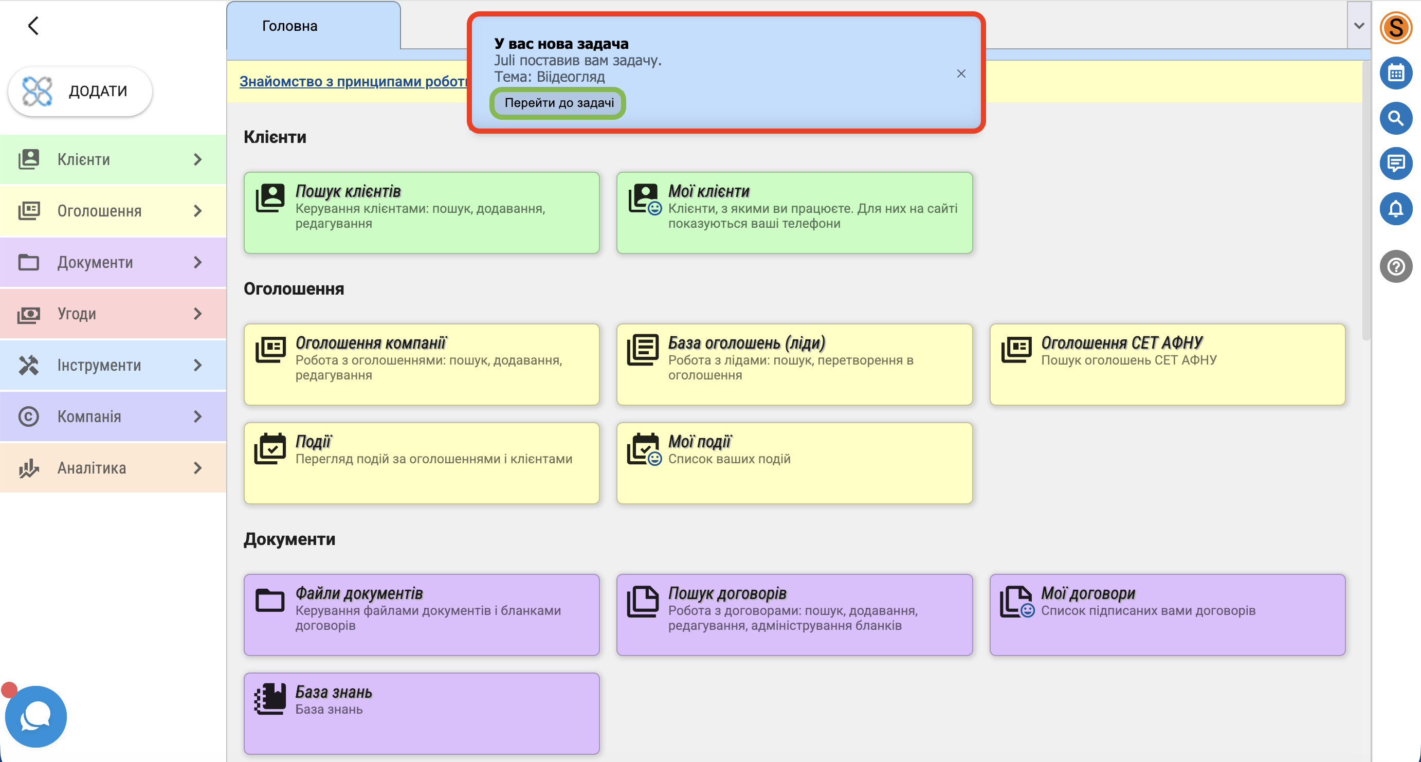Співробітник може одразу переглянути деталі нової задачі, натиснувши "Перейти до задачі".