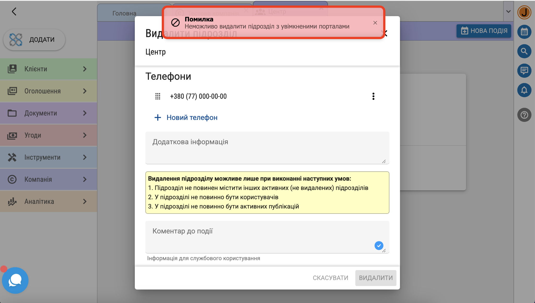 Виправте те, що стало підставою для помилки (у наведеному прикладі - виключіть рекламний портал) та знов натисніть "Нова подія" - "Видалити підрозділ".