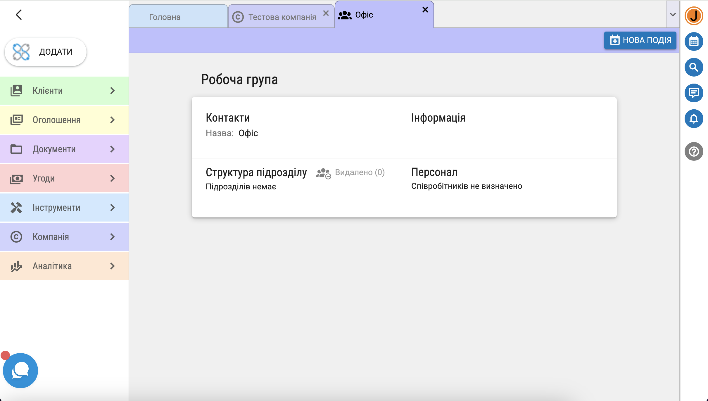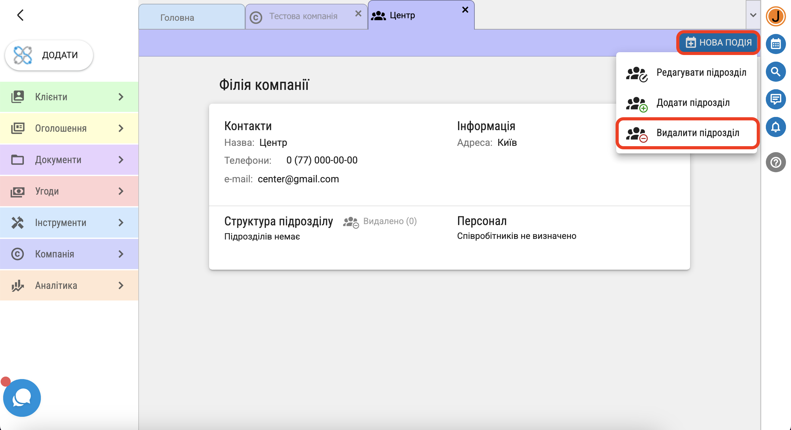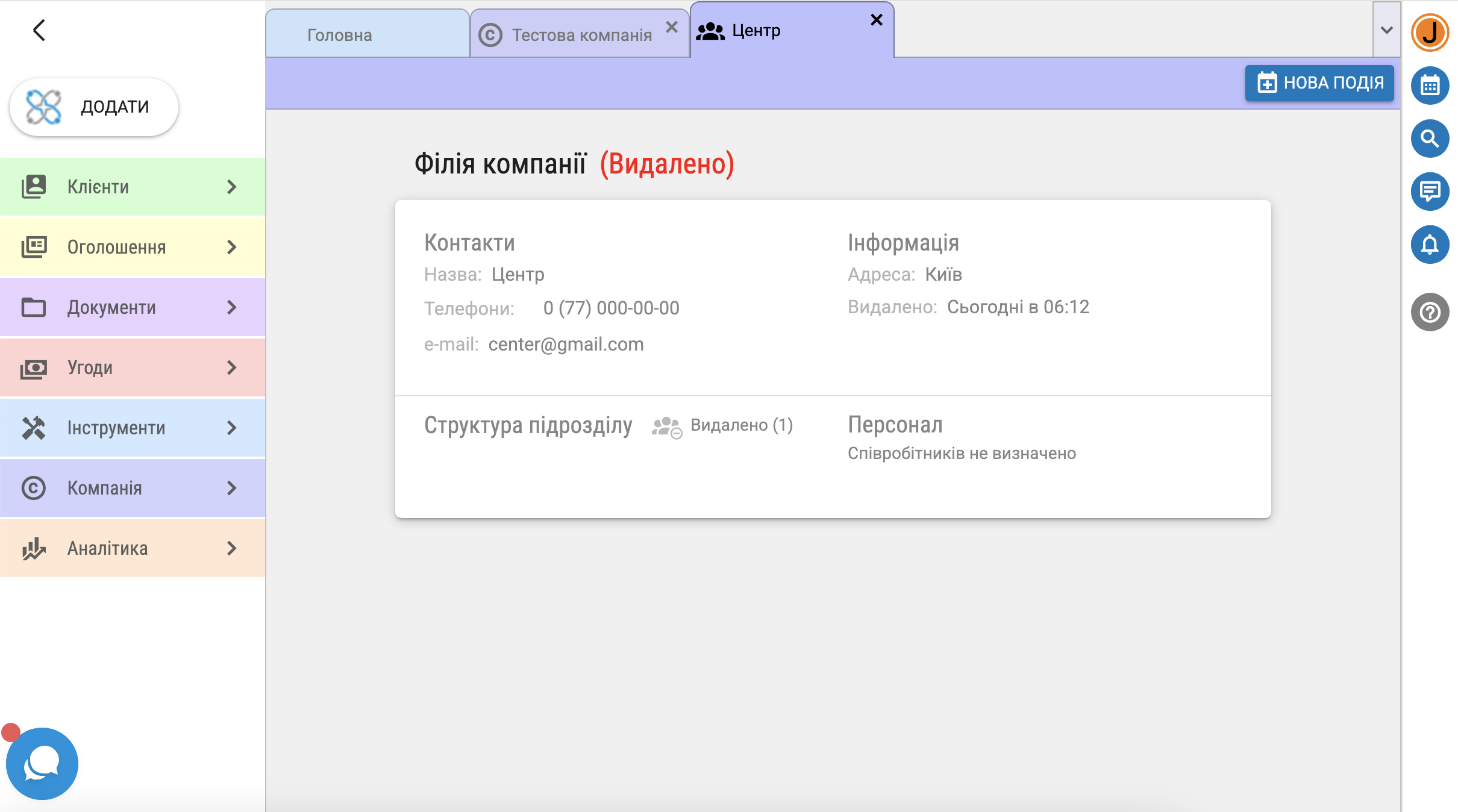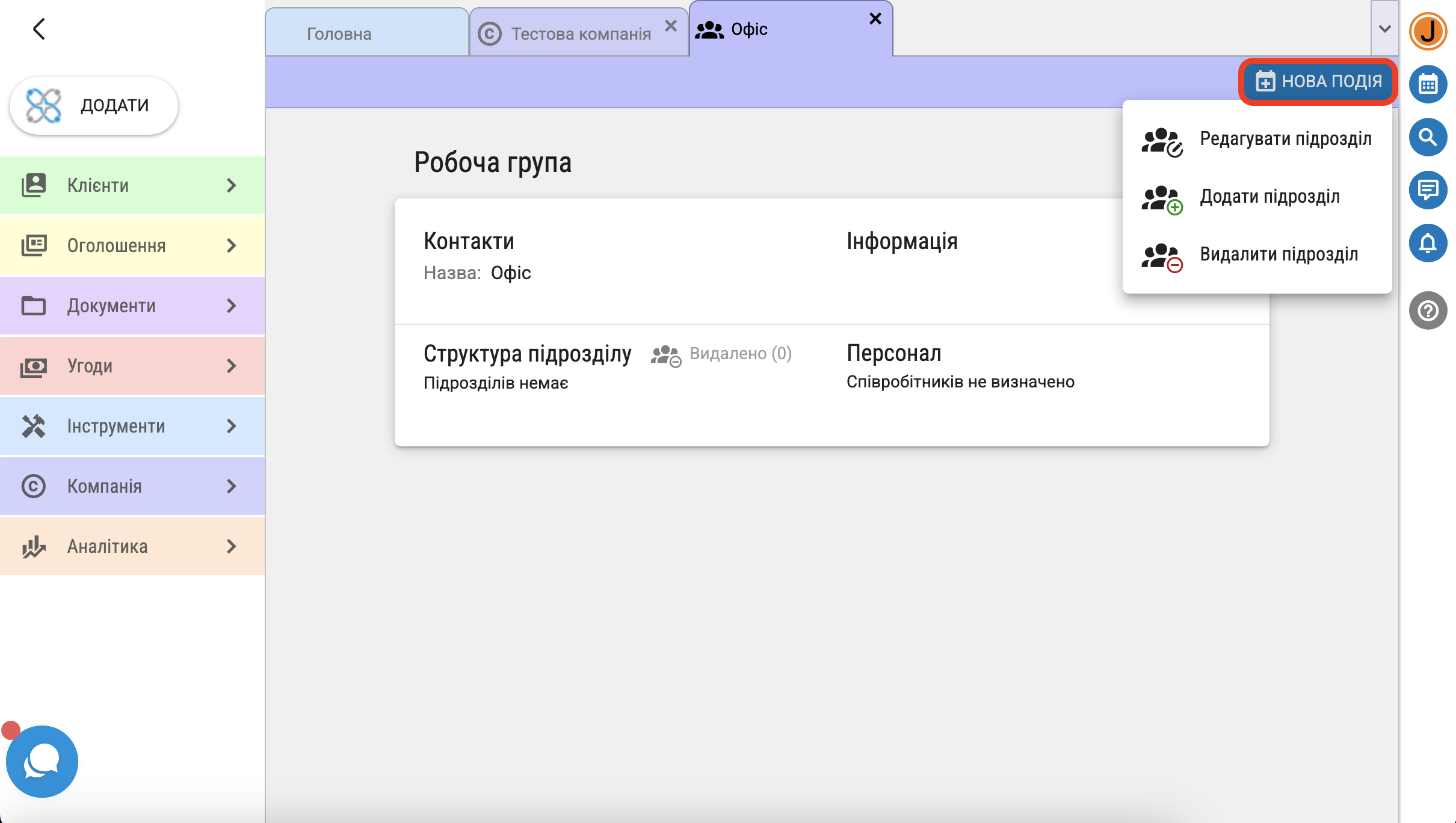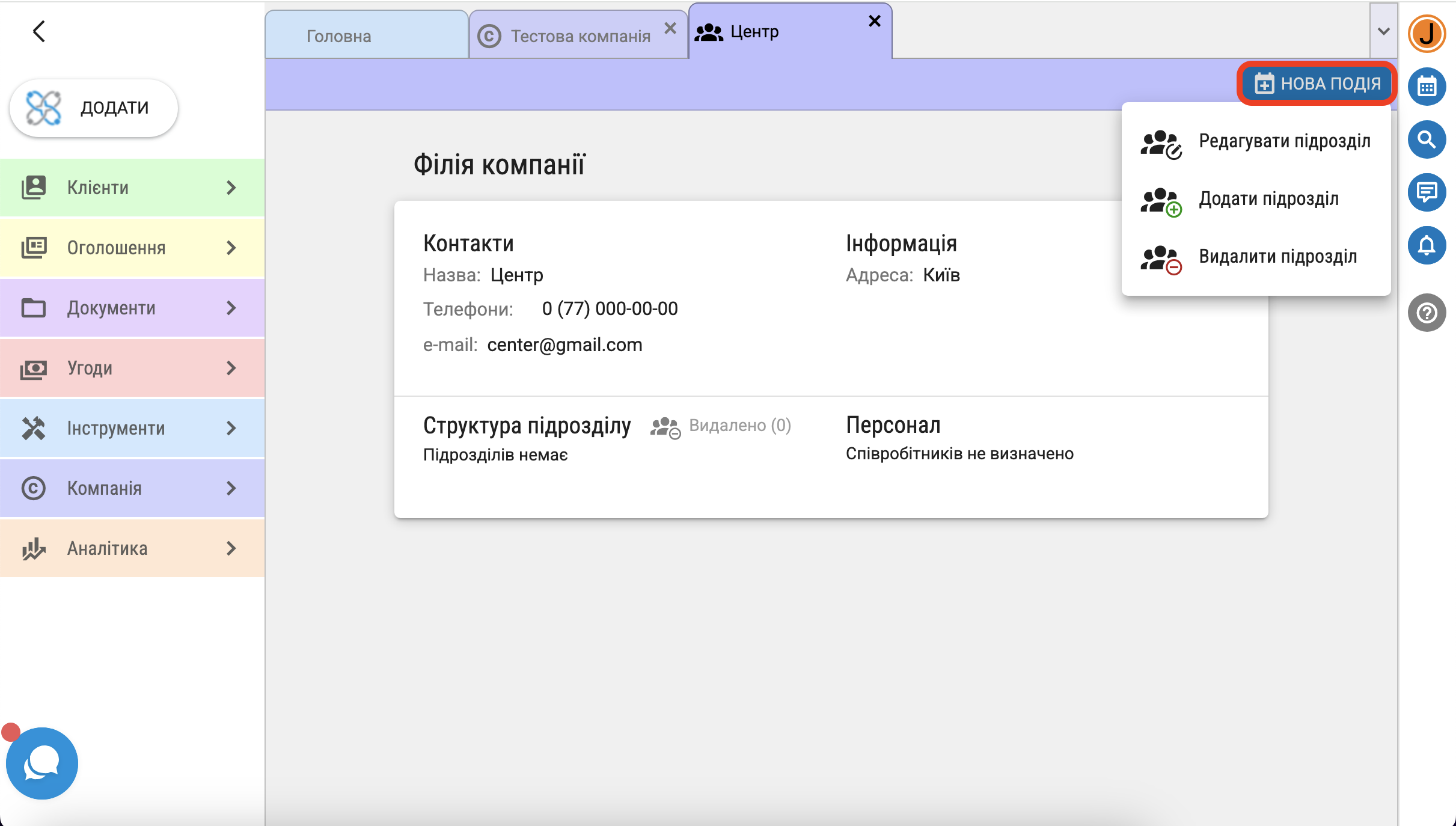 Після збереження буде відкрито вкладку "Філія компанії детально" з можливістю вносити корективи по цьому підрозділу. Натисніть "Нова подія" та виберіть необхідну дію: