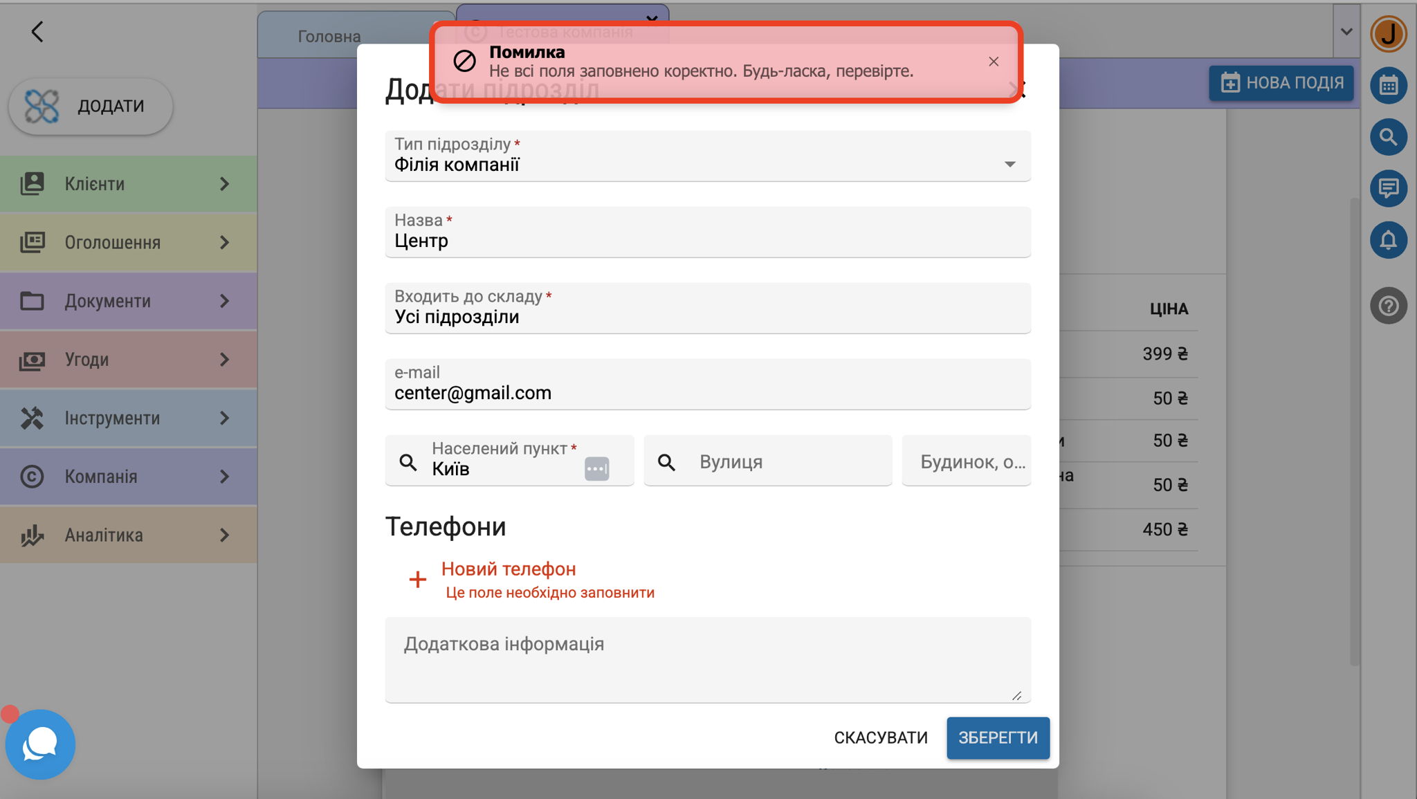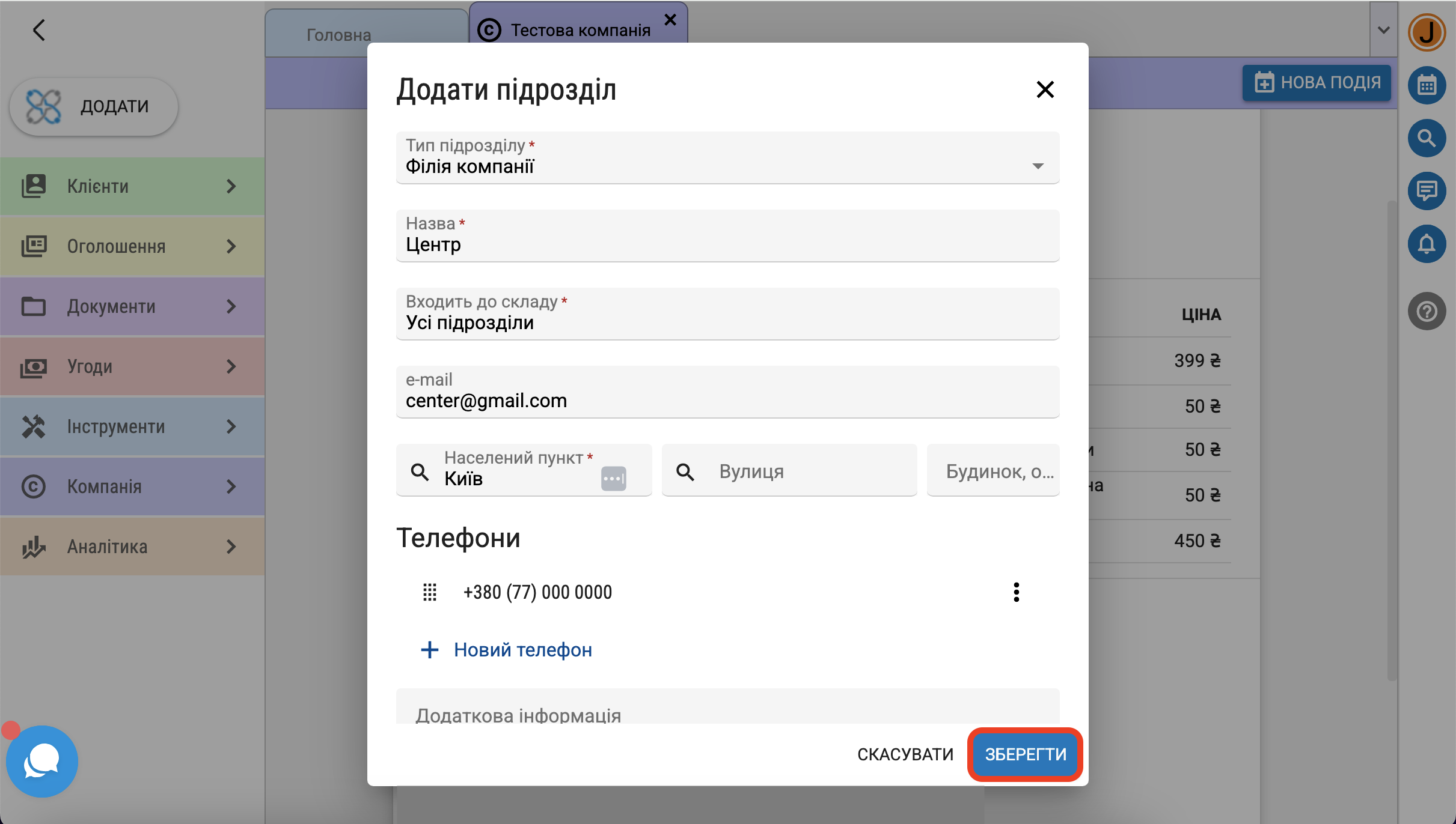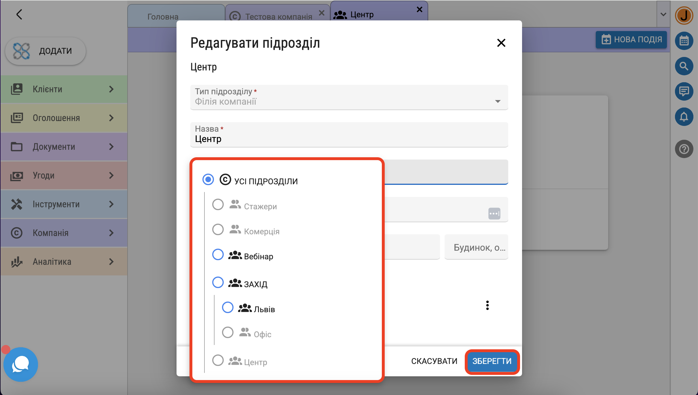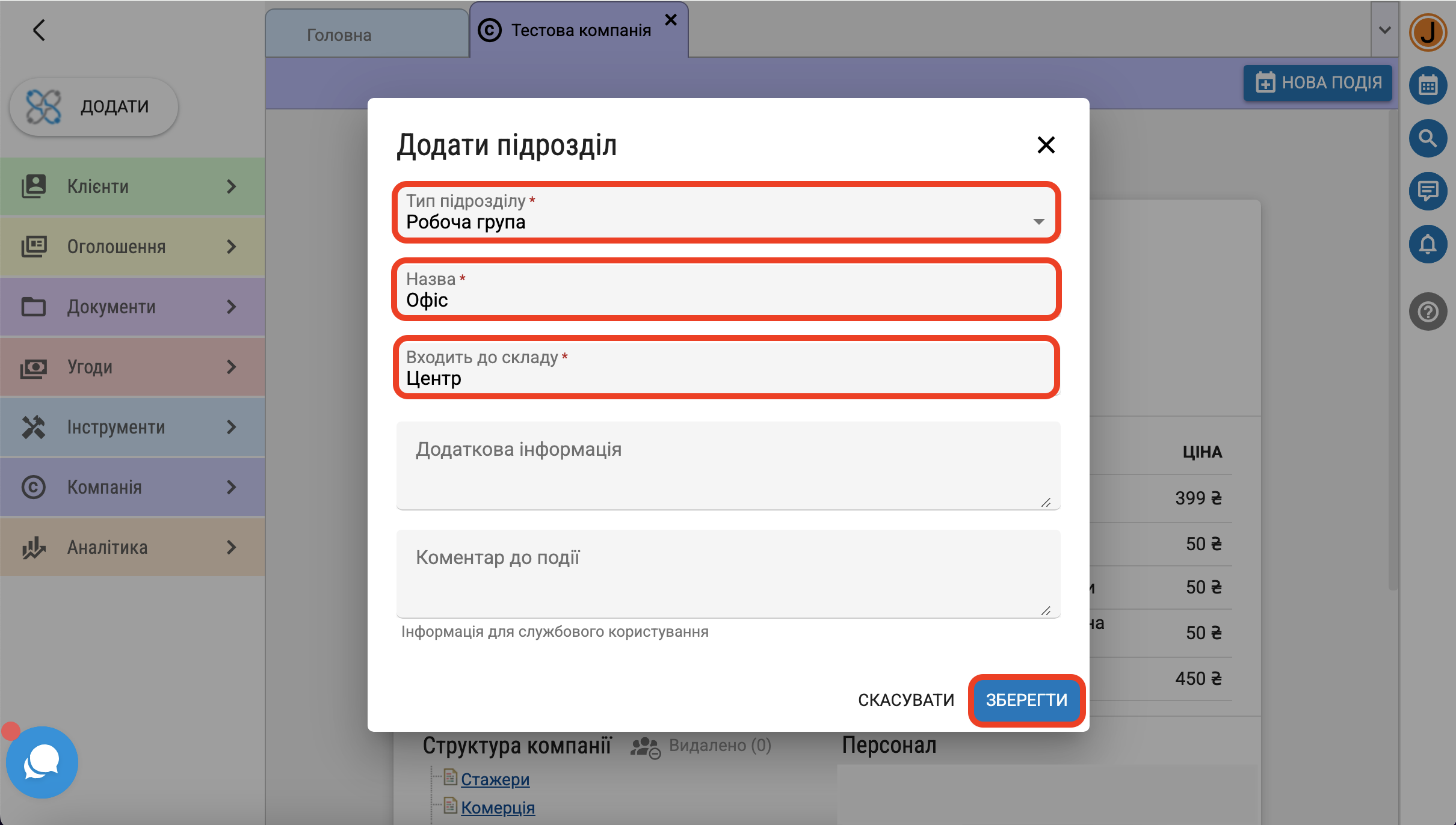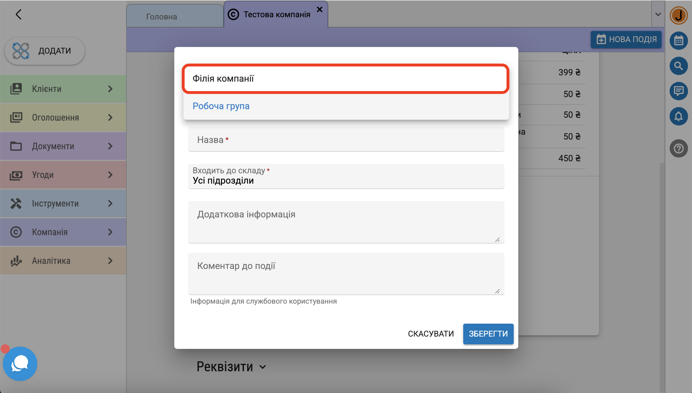Після збереження буде відкрито вкладку "Філія компанії детально" з можливістю вносити корективи по цьому підрозділу. Натисніть "Нова подія" та виберіть необхідну дію: