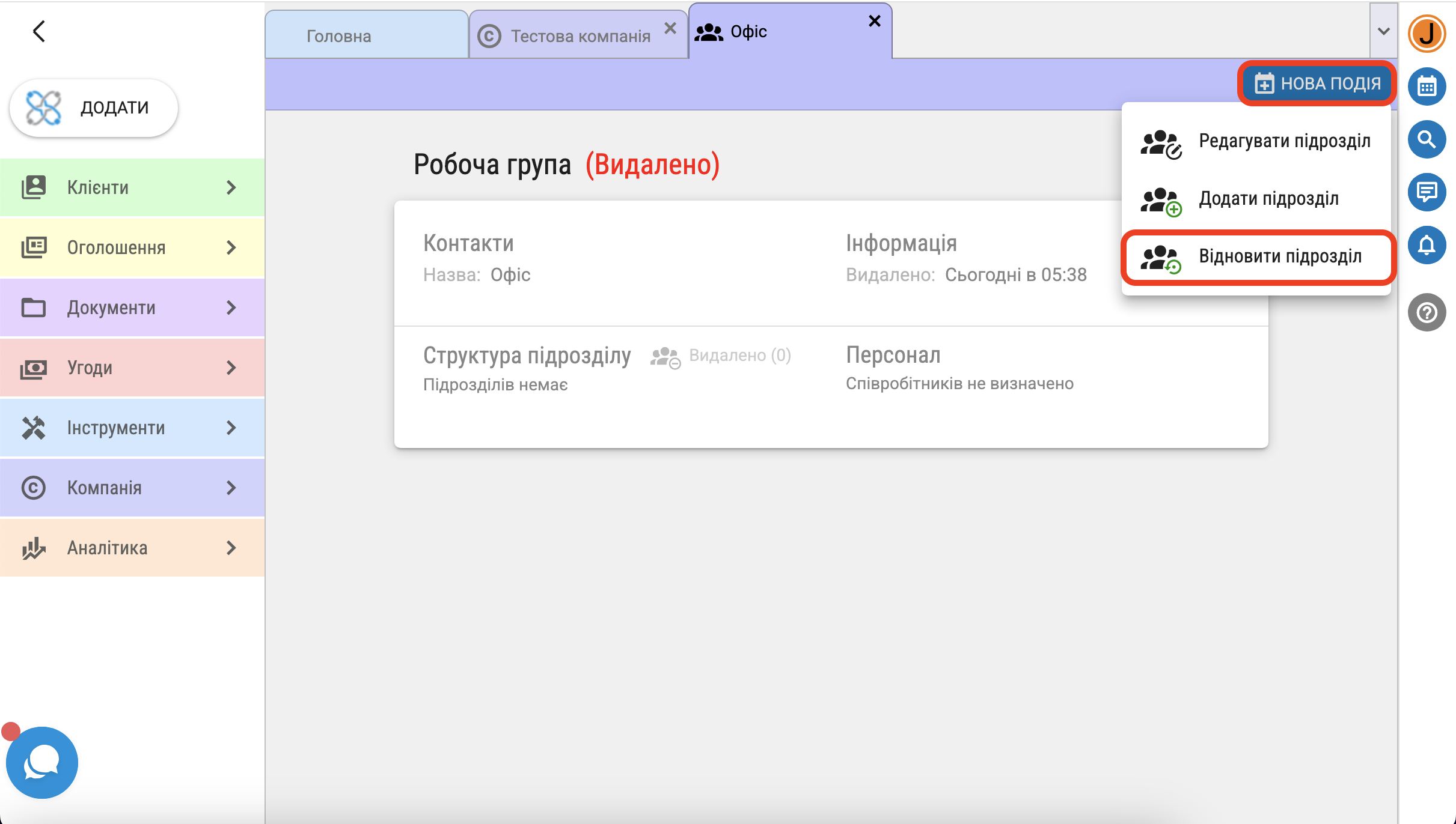 Для відновлення видаленого підрозділу перейдіть в меню до "Компанія" - "Назва компанії" та натисніть у структурі компанії "Видалено".