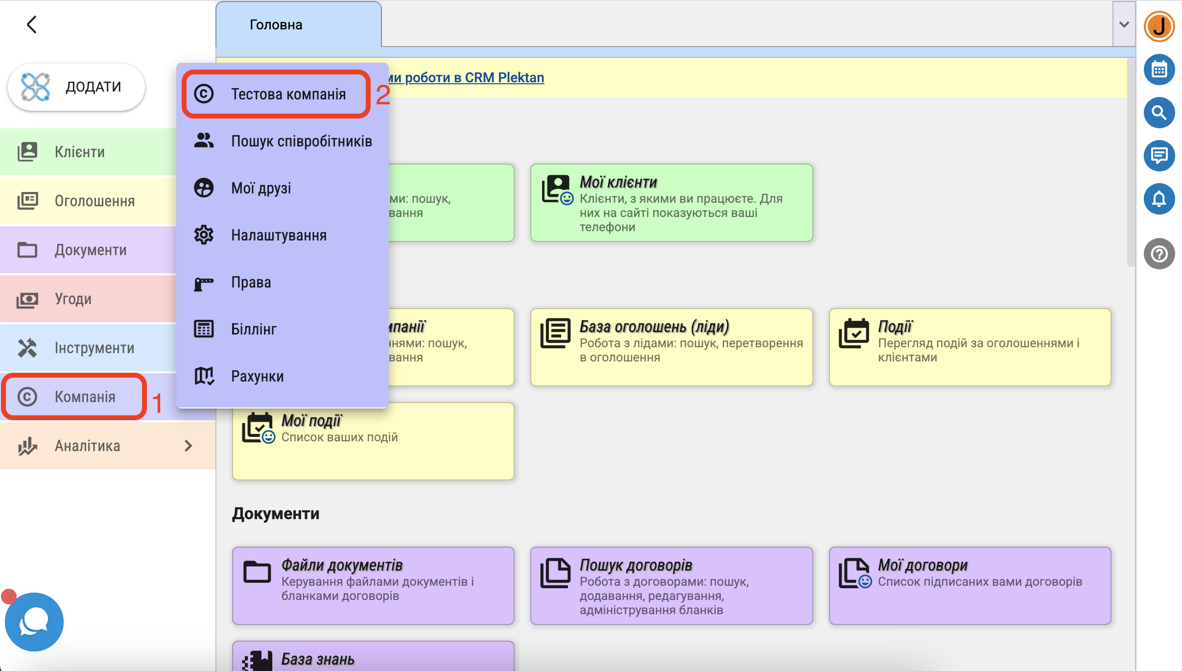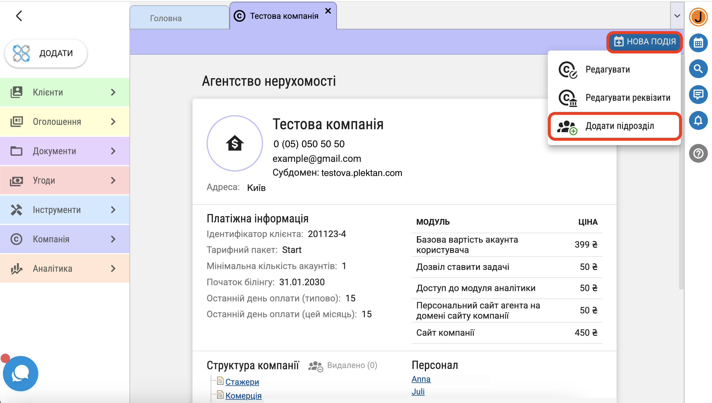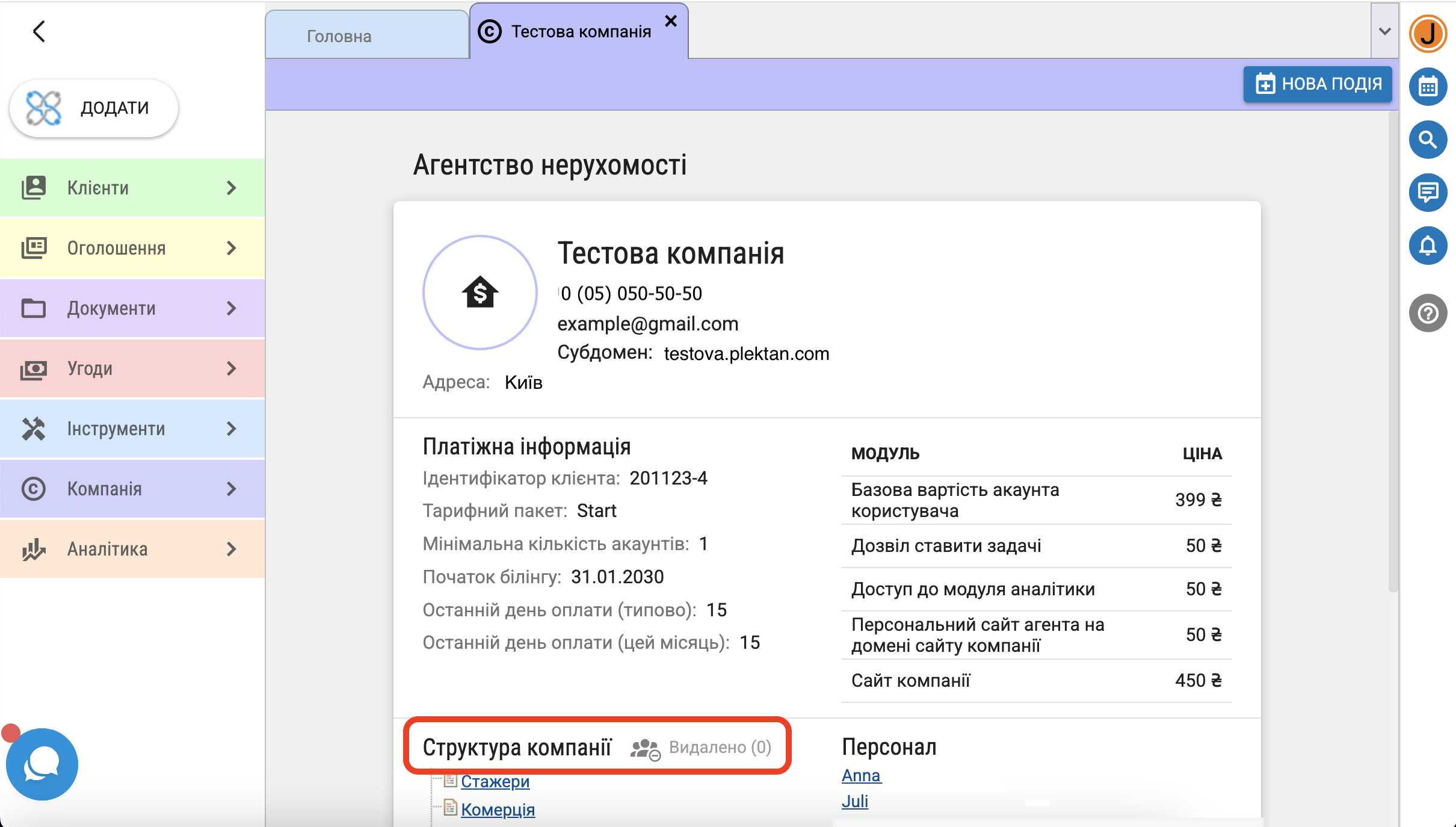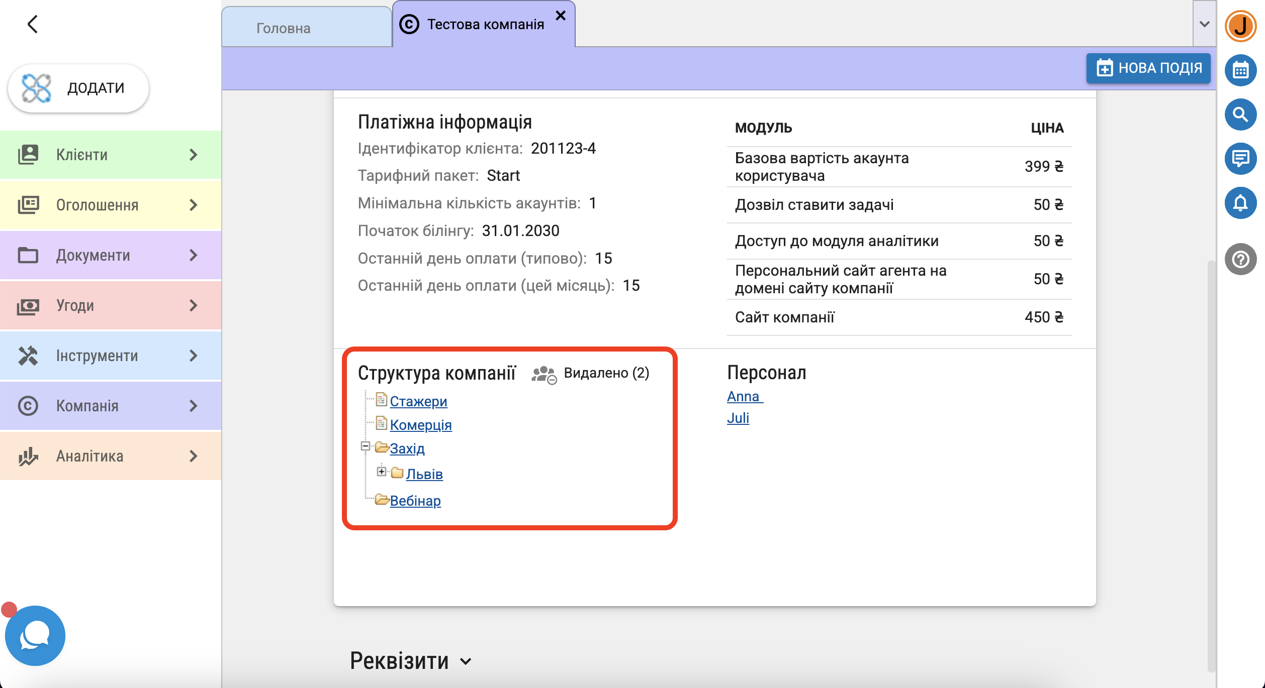 Для налаштування структури компанії натисніть пункт меню "Компанія"- "АН (Назва вашої компанії)".