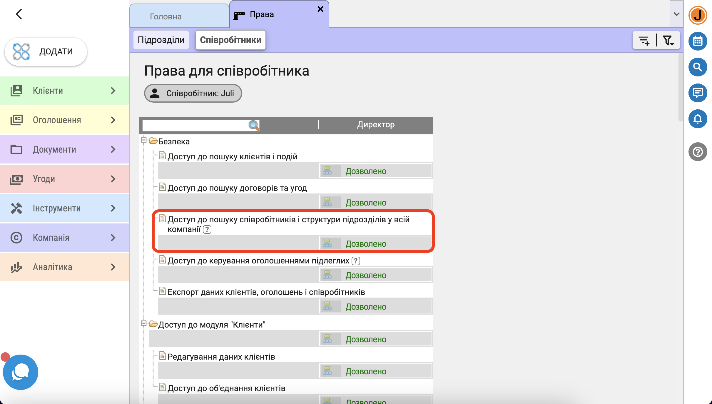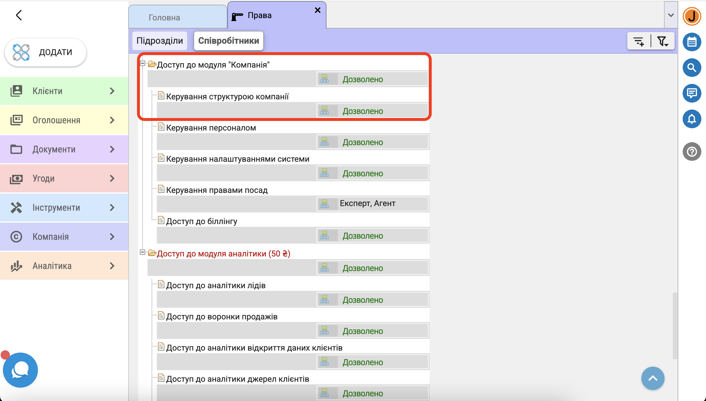 Бачити структуру компанії та виконувати будь-які дії щодо її змін можуть ті співробітники, для яких в правах активовано відповідні дозволи: