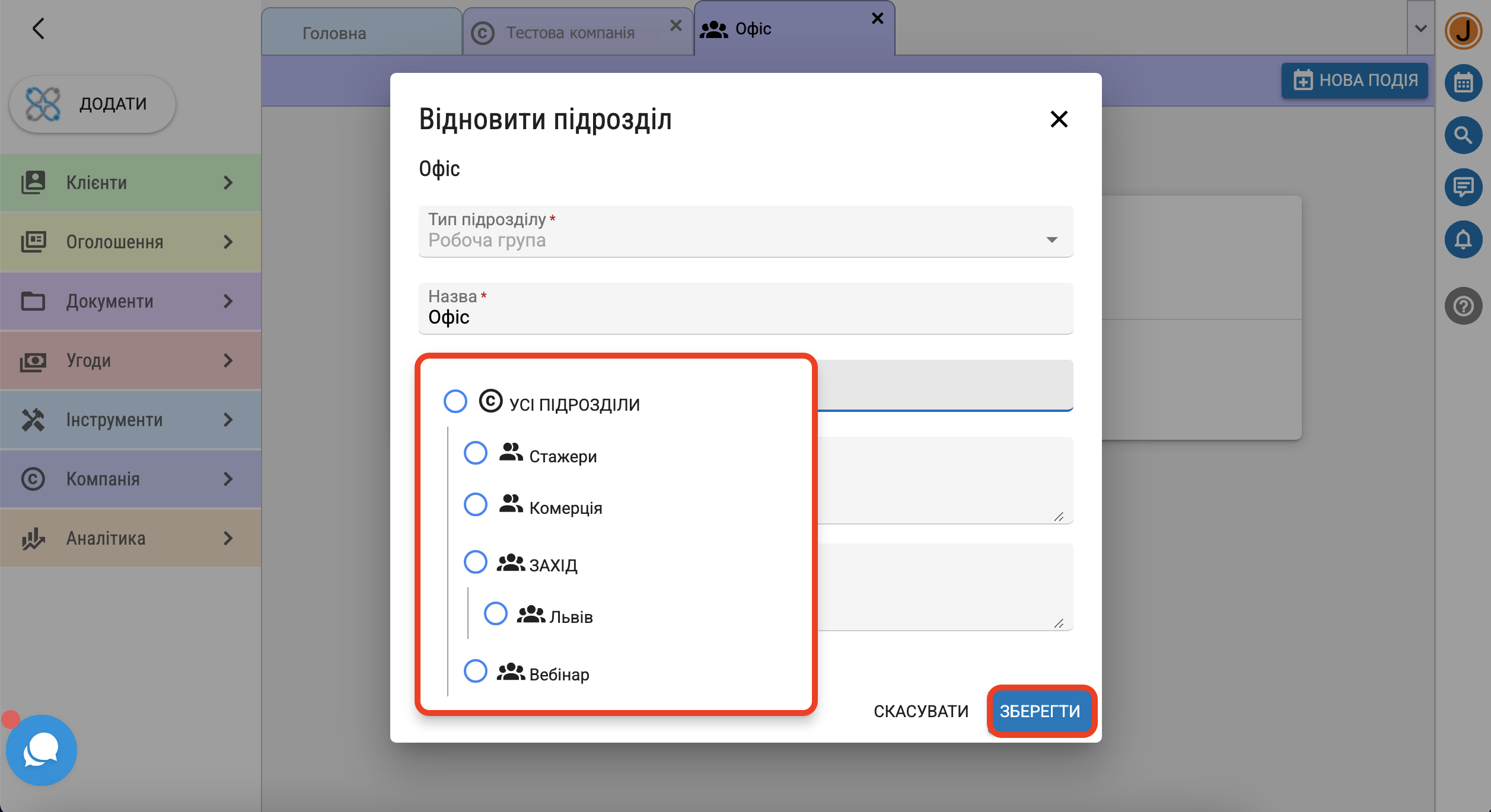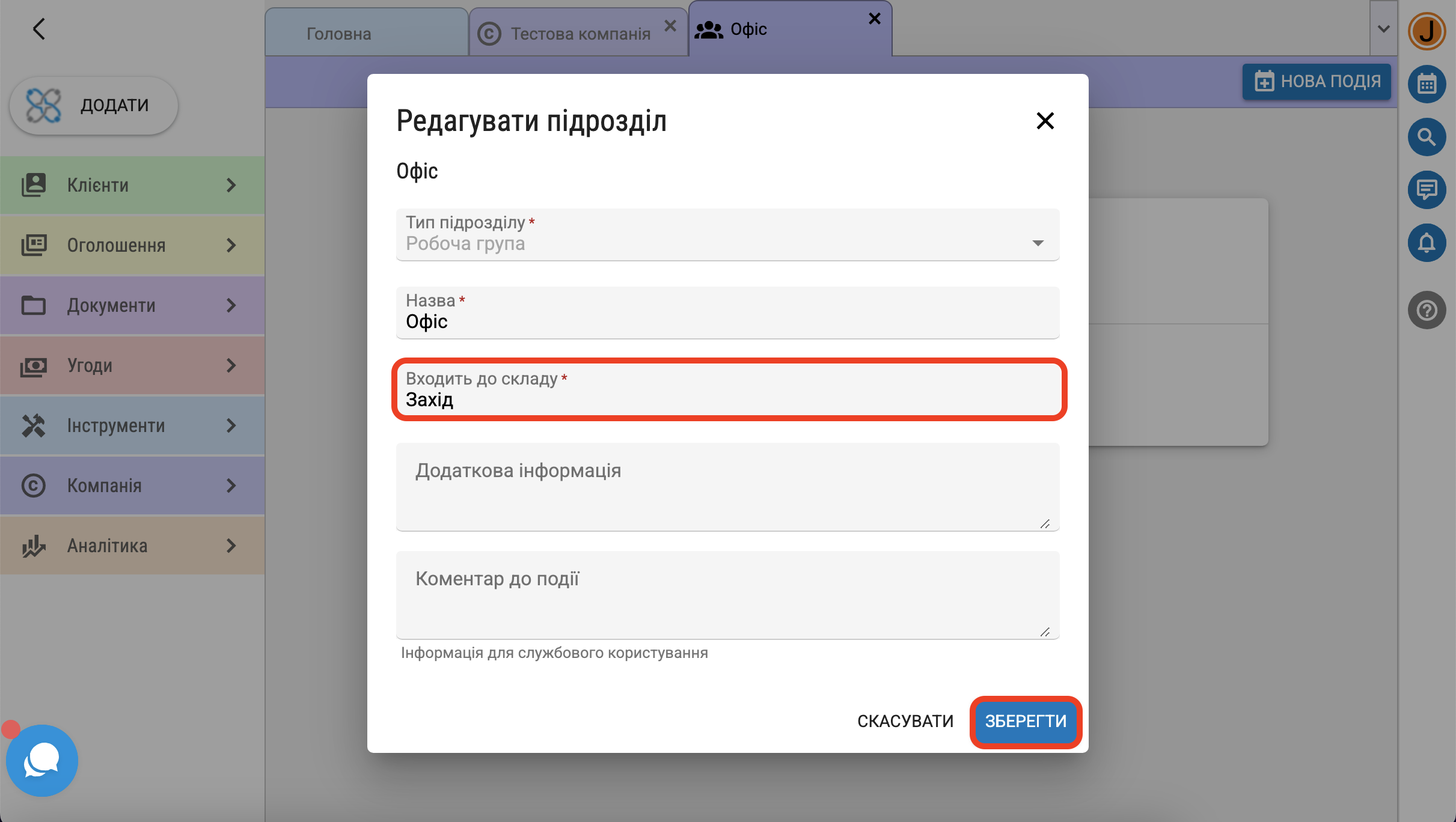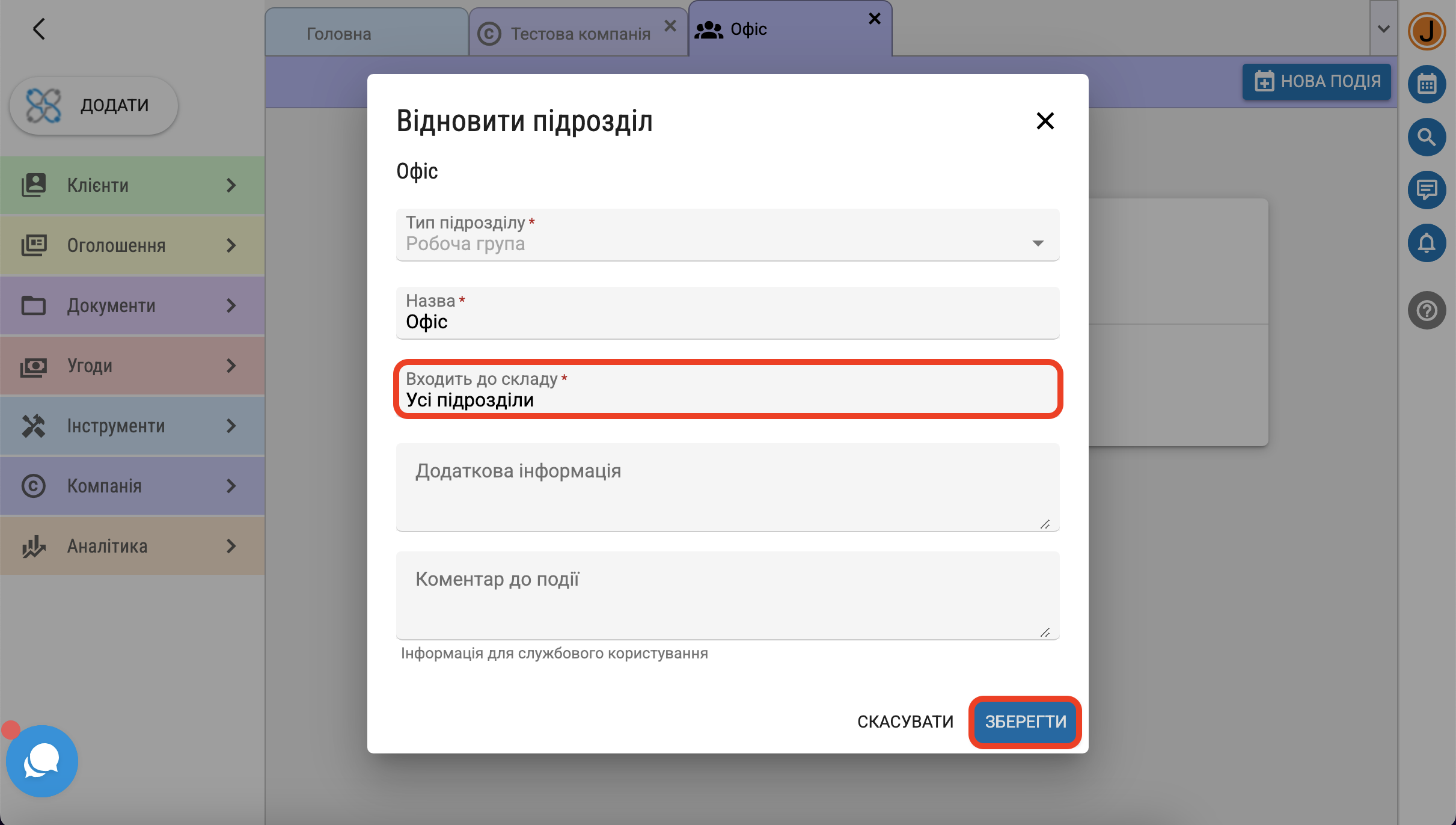 Для цього в полі "Входить до складу" оберіть потрібний підрозділ і збережіть зміни натисканням кнопки "Зберегти".