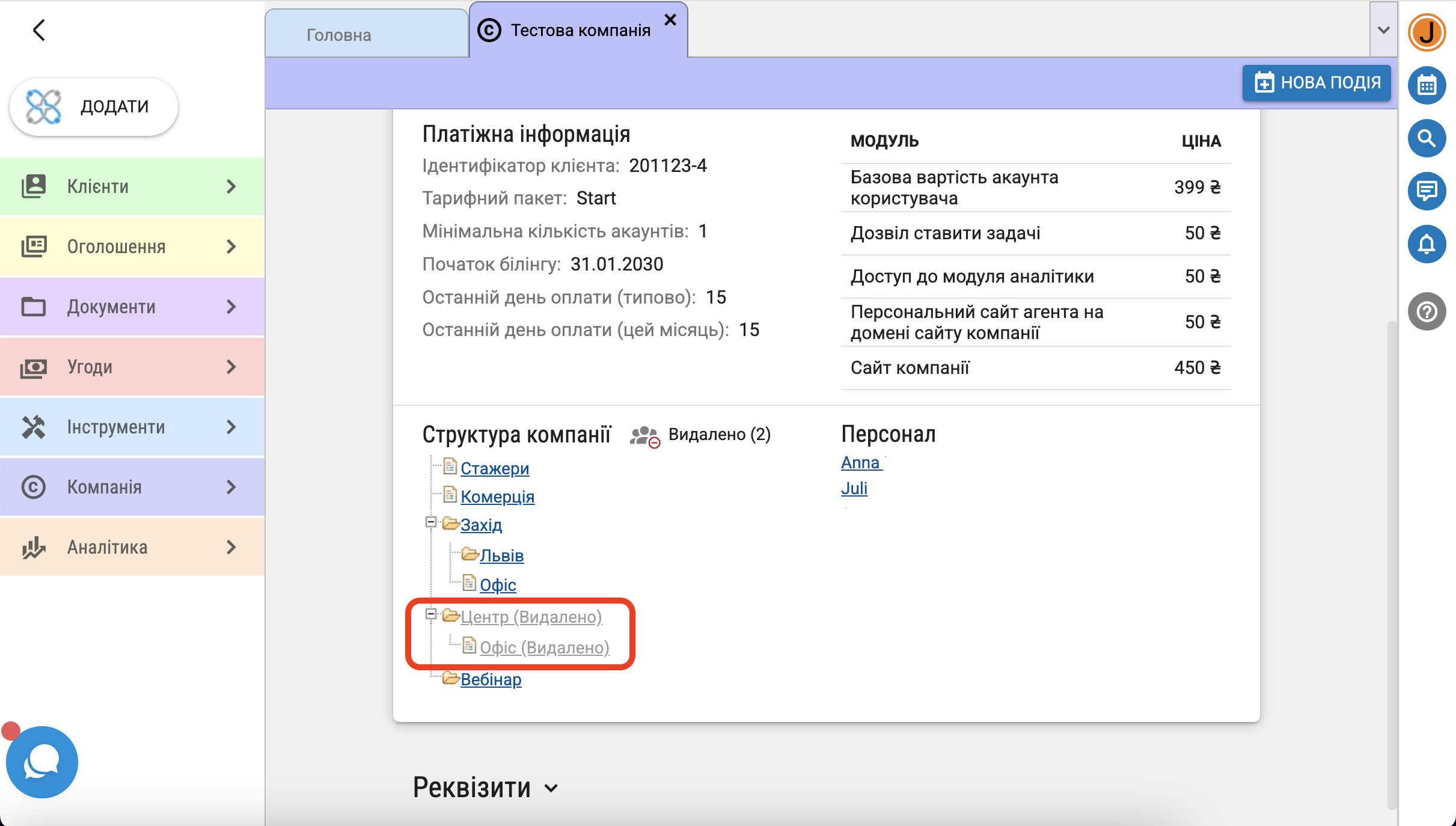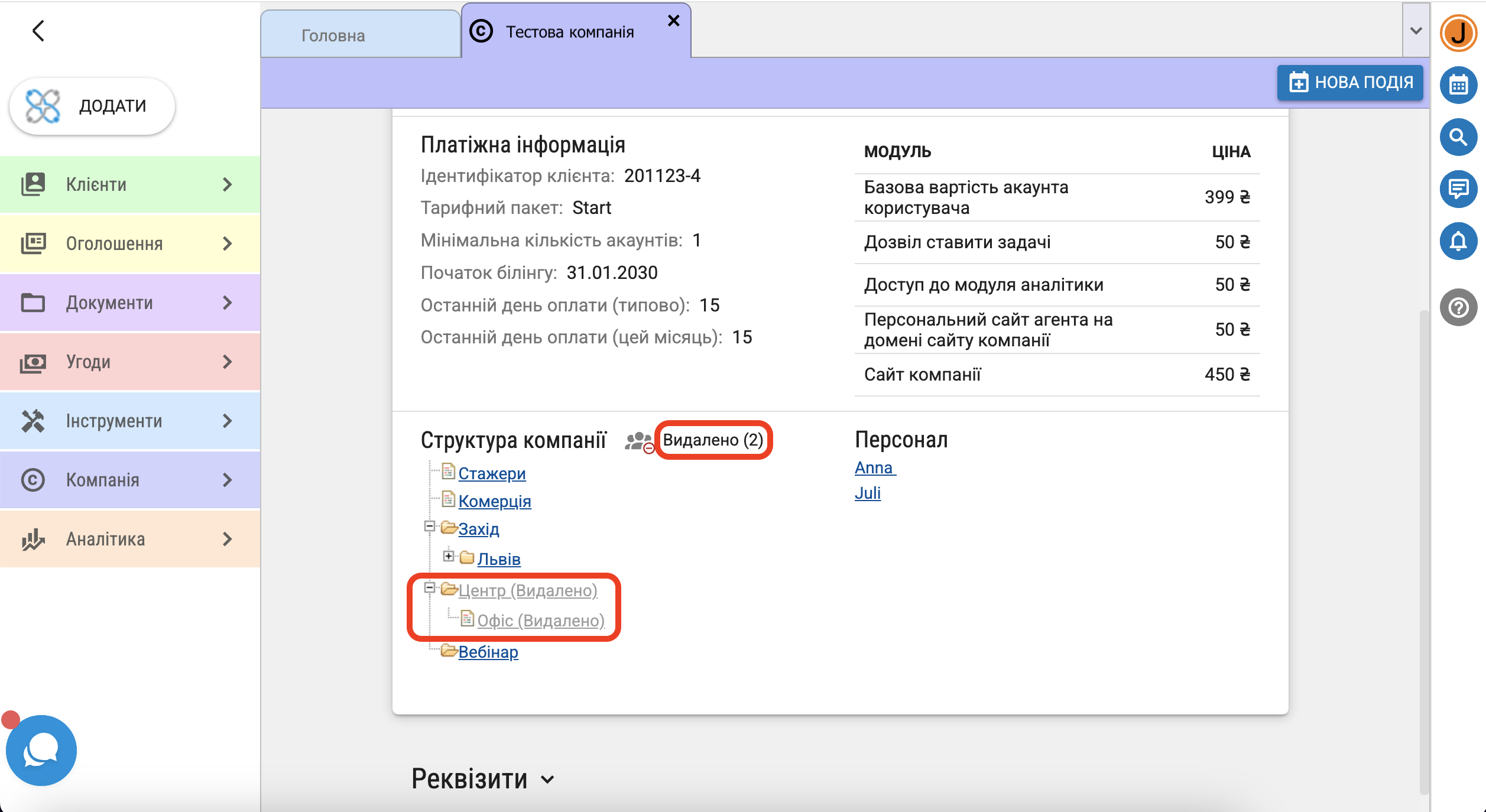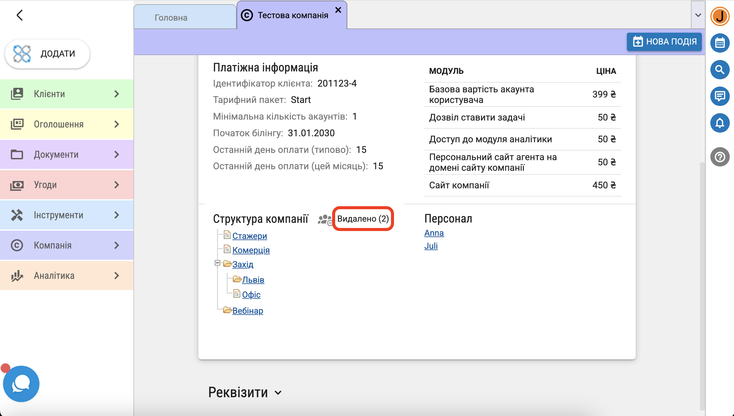 Але при натисканні на "Видалено" він з'явиться в загальній структурі компанії.