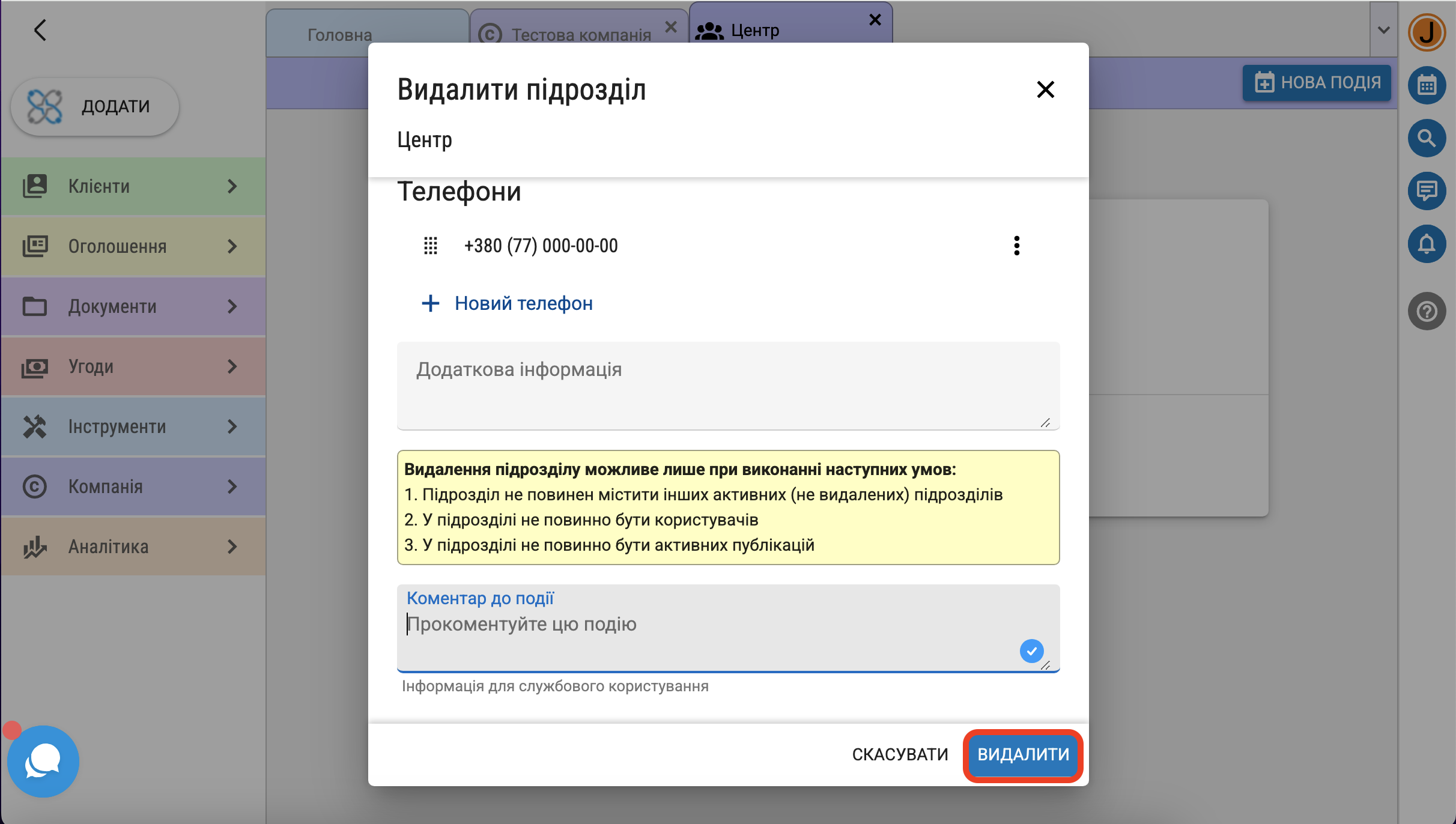 Відкриється нове вікно "Видалити підрозділ". За потреби залиште коментар до події та натисніть "Видалити".