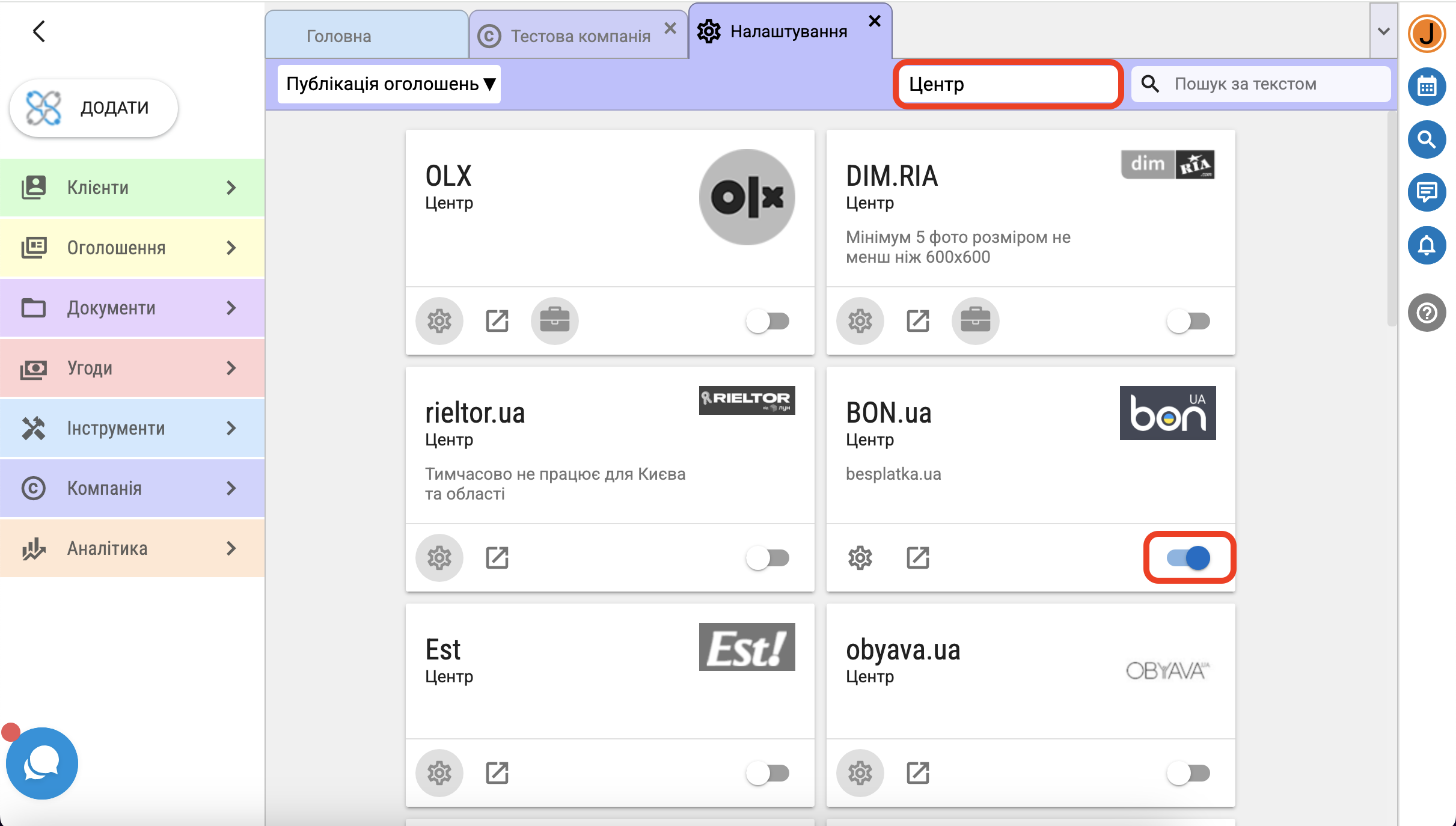 2. Перейдіть до модуля "Компанія" - "Налаштування" - "Публікація оголошень", оберіть потрібний підрозділ та вимкніть для нього всі активні публікації (натисніть всі перемикачі синього кольору, щоб вони стали сірими).