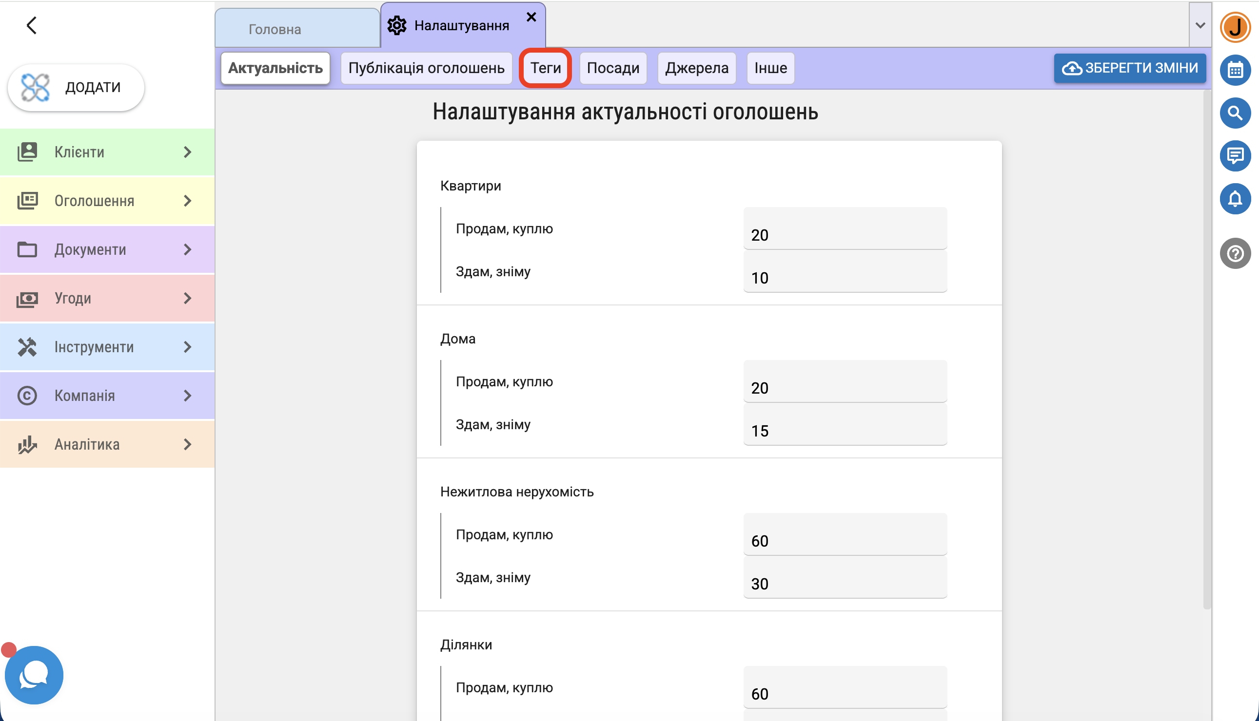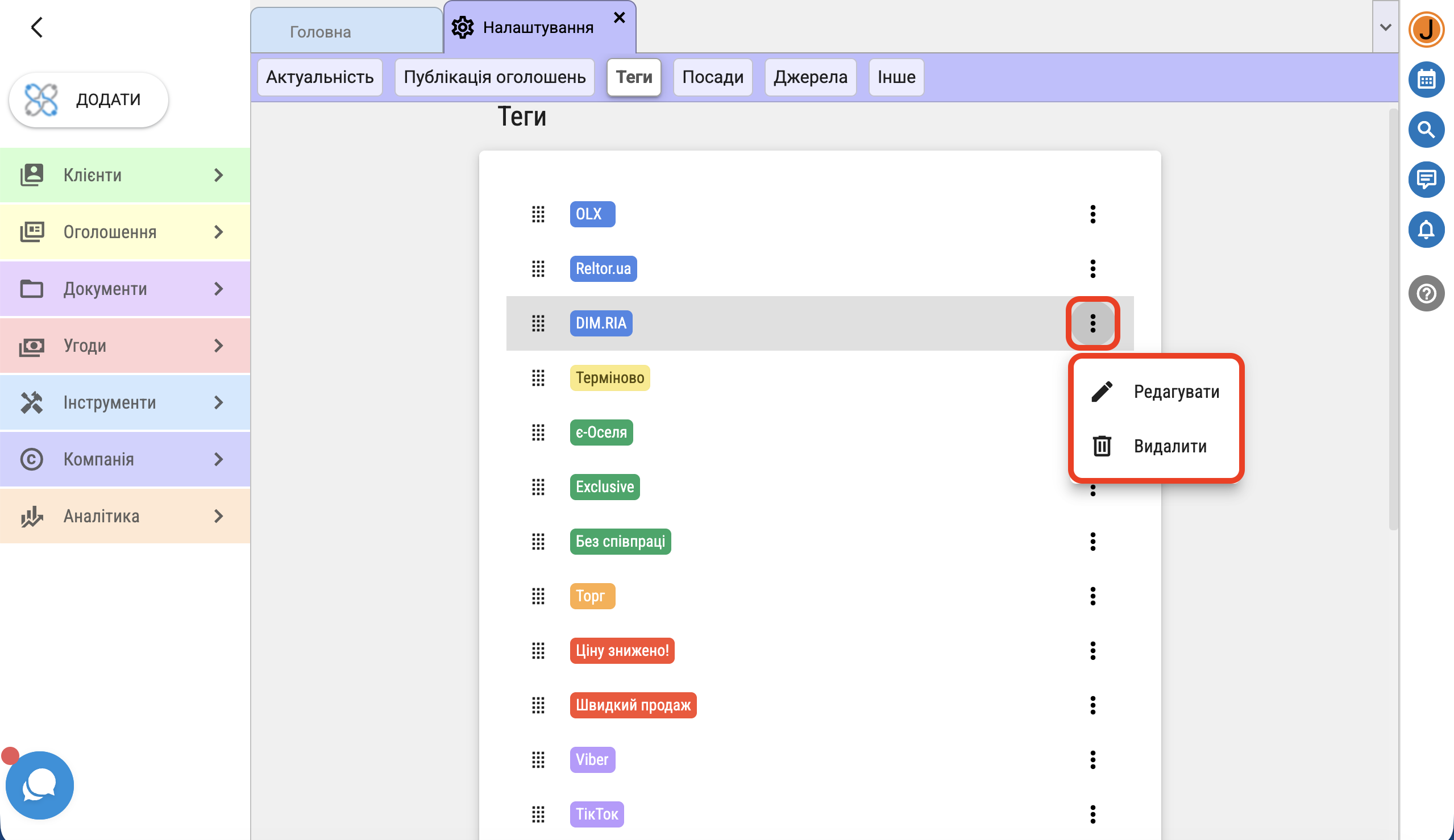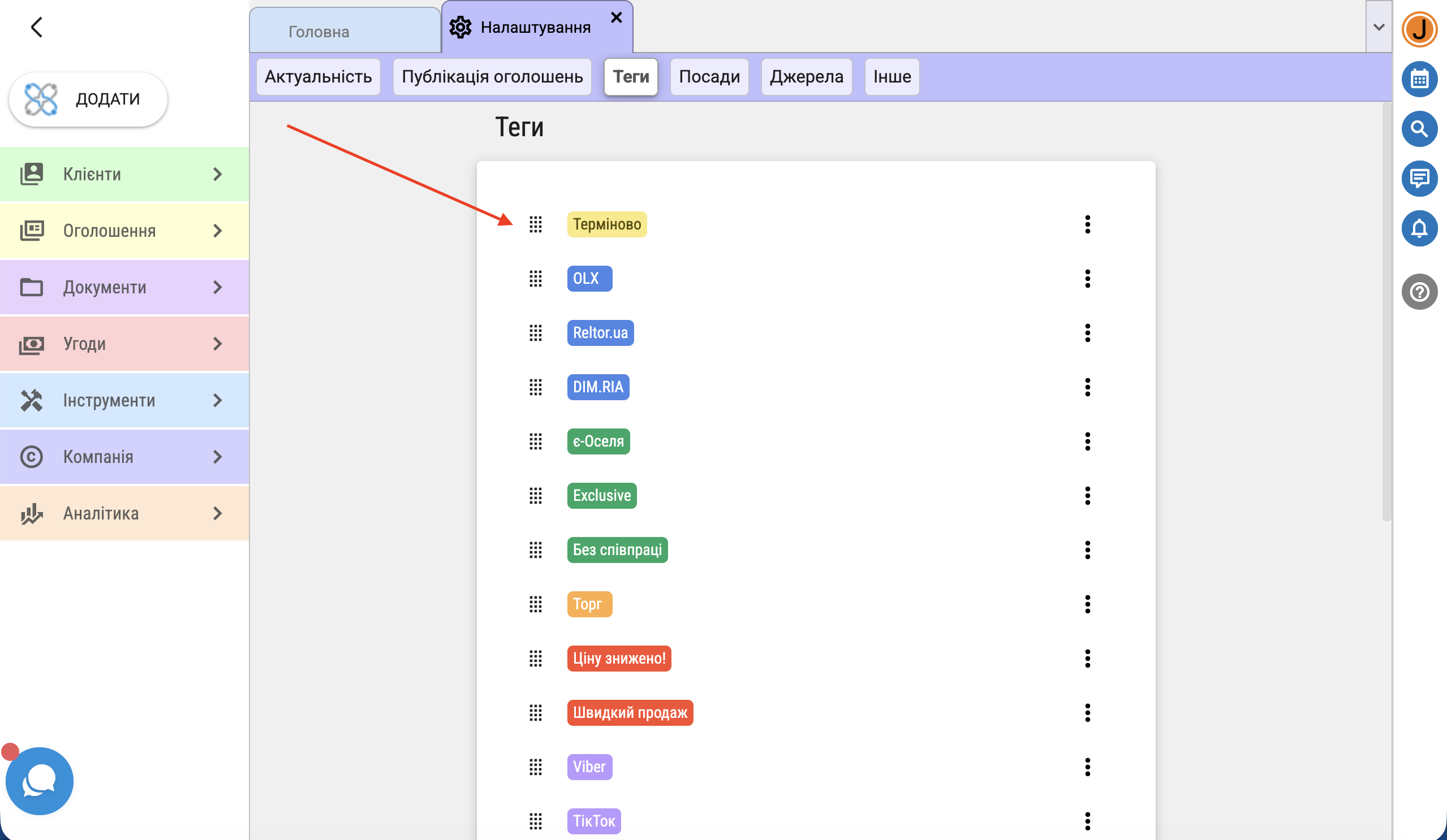 В системі є можливість створювати теги для подальшого використання, наприклад, щоб позначити оголошення чи клієнта.