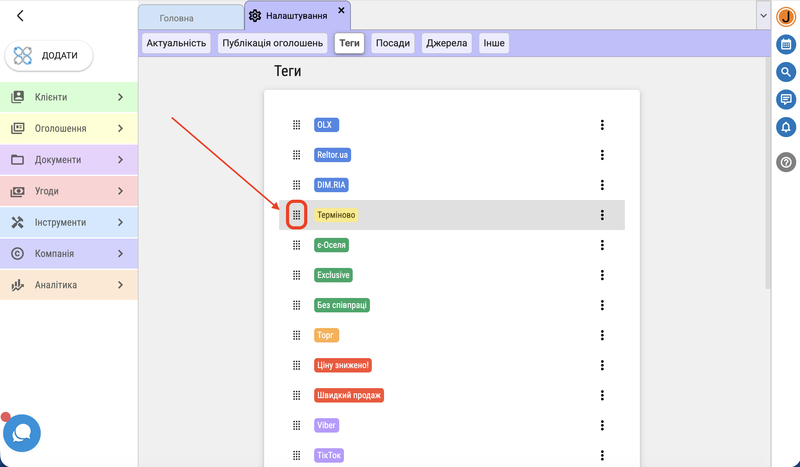 Порядок відображення тегів в переліку можна змінювати за потреби. Для цього натисніть на "крапки" зліва від назви тегу та перетягніть його на потрібну позицію, не відпускаючи кнопку миші. У наведеному нижче прикладі, тег "Терміново" переміщено з четвертого місця в списку на перше.