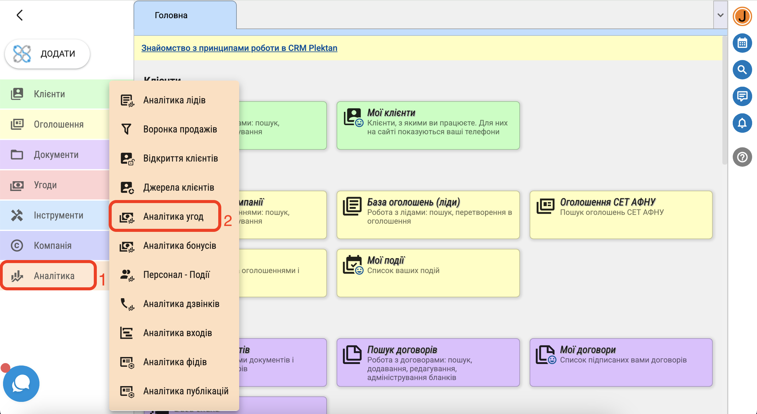Для перегляду статистики щодо прибутковості угод вашої компанії натисніть в меню "Аналітика" - "Аналітика угод".