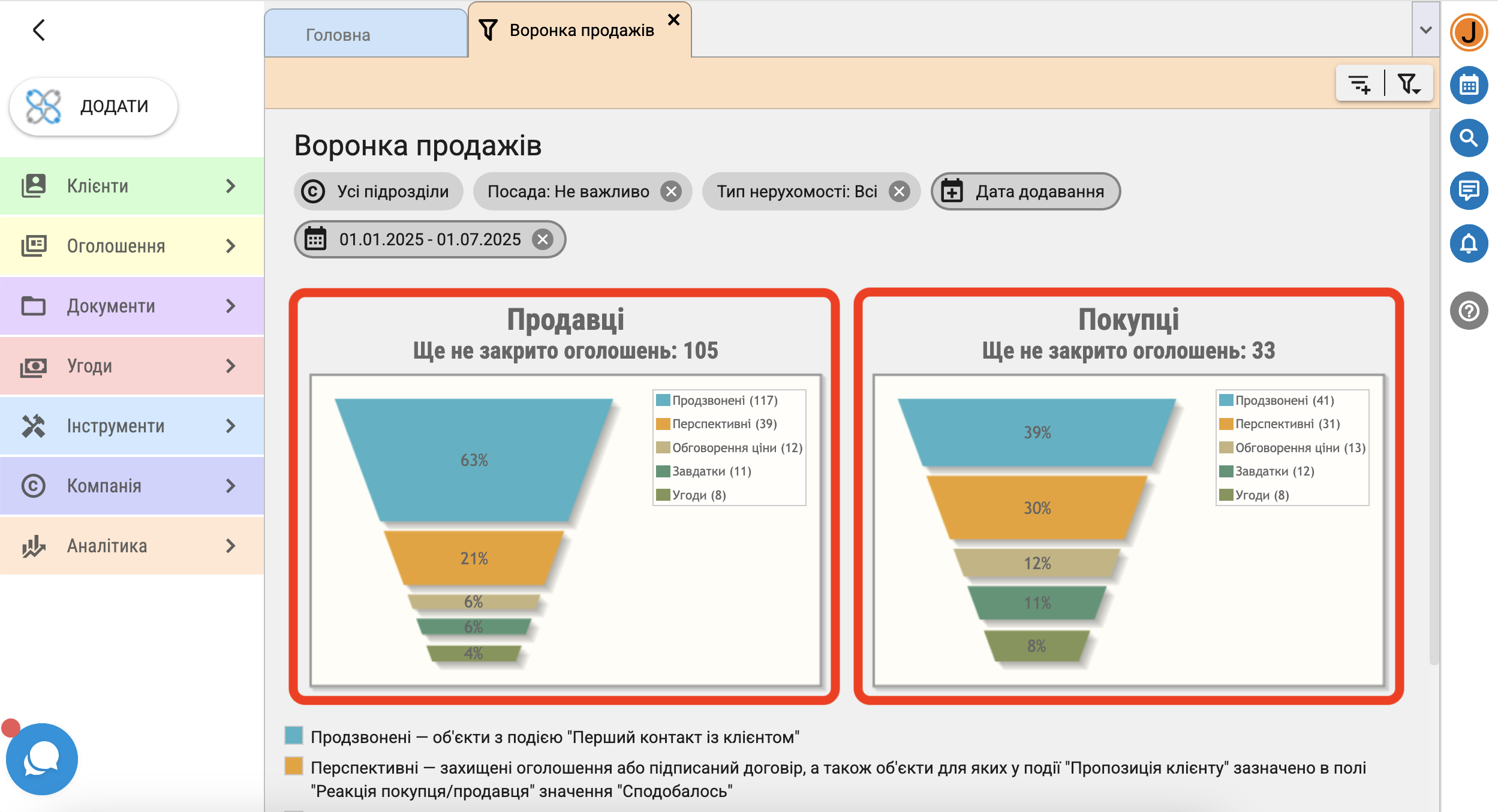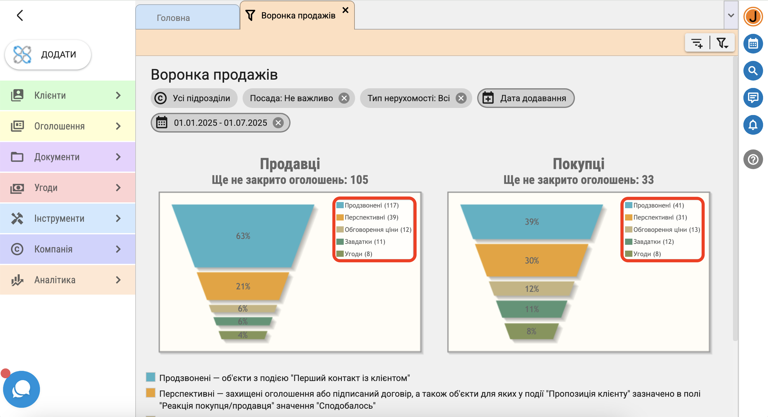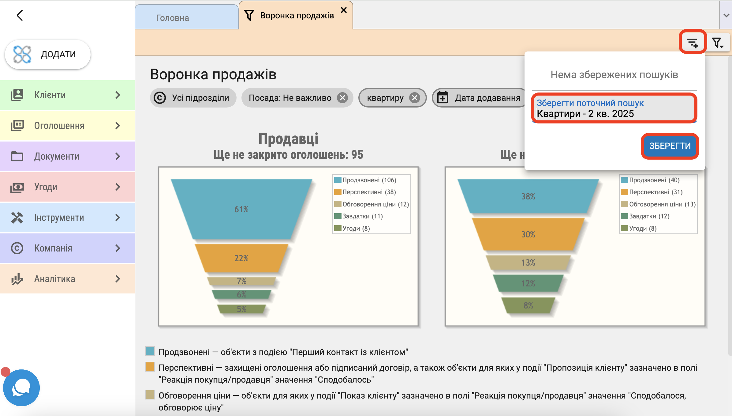 - перспективні ー захищені оголошення або з підписаним договором, а також об'єкти для яких у події "Пропозиція клієнту" в полі "Реакція покупця/продавця" зазначено "Сподобалось"