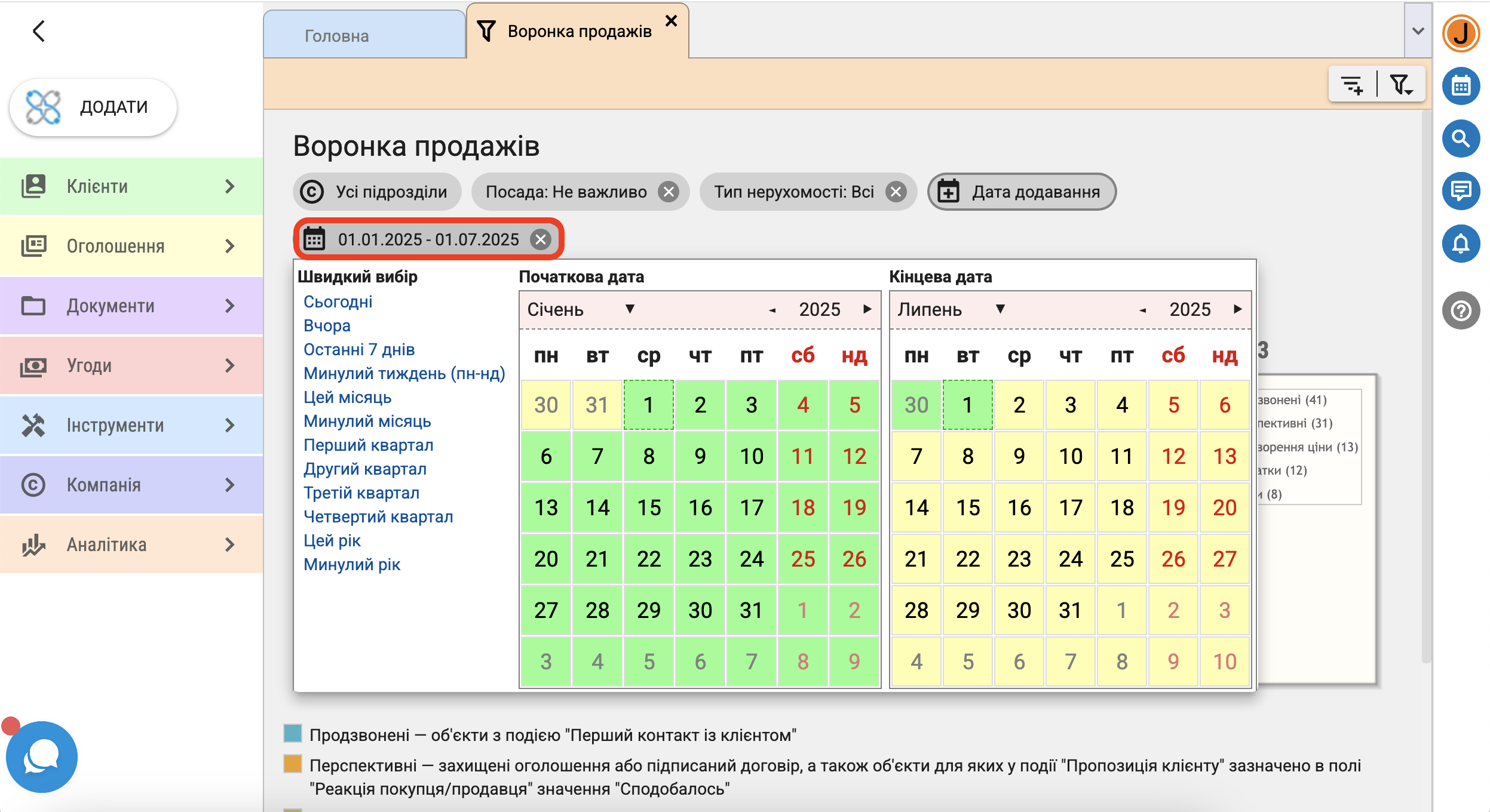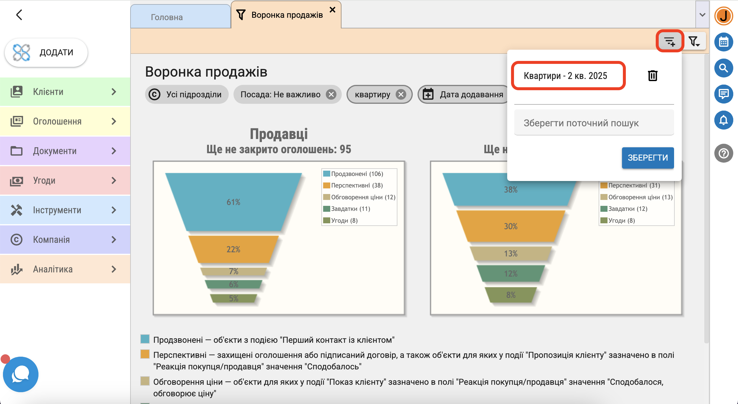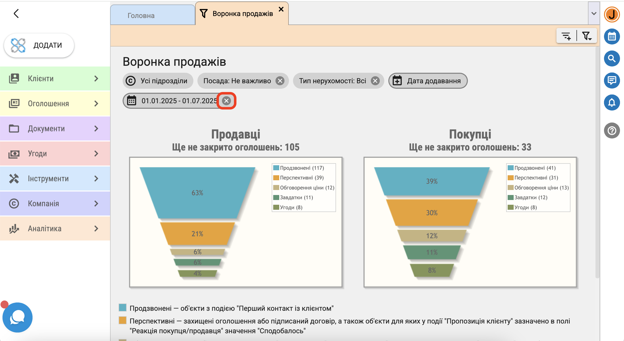 - перспективні ー захищені оголошення або з підписаним договором, а також об'єкти для яких у події "Пропозиція клієнту" в полі "Реакція покупця/продавця" зазначено "Сподобалось"