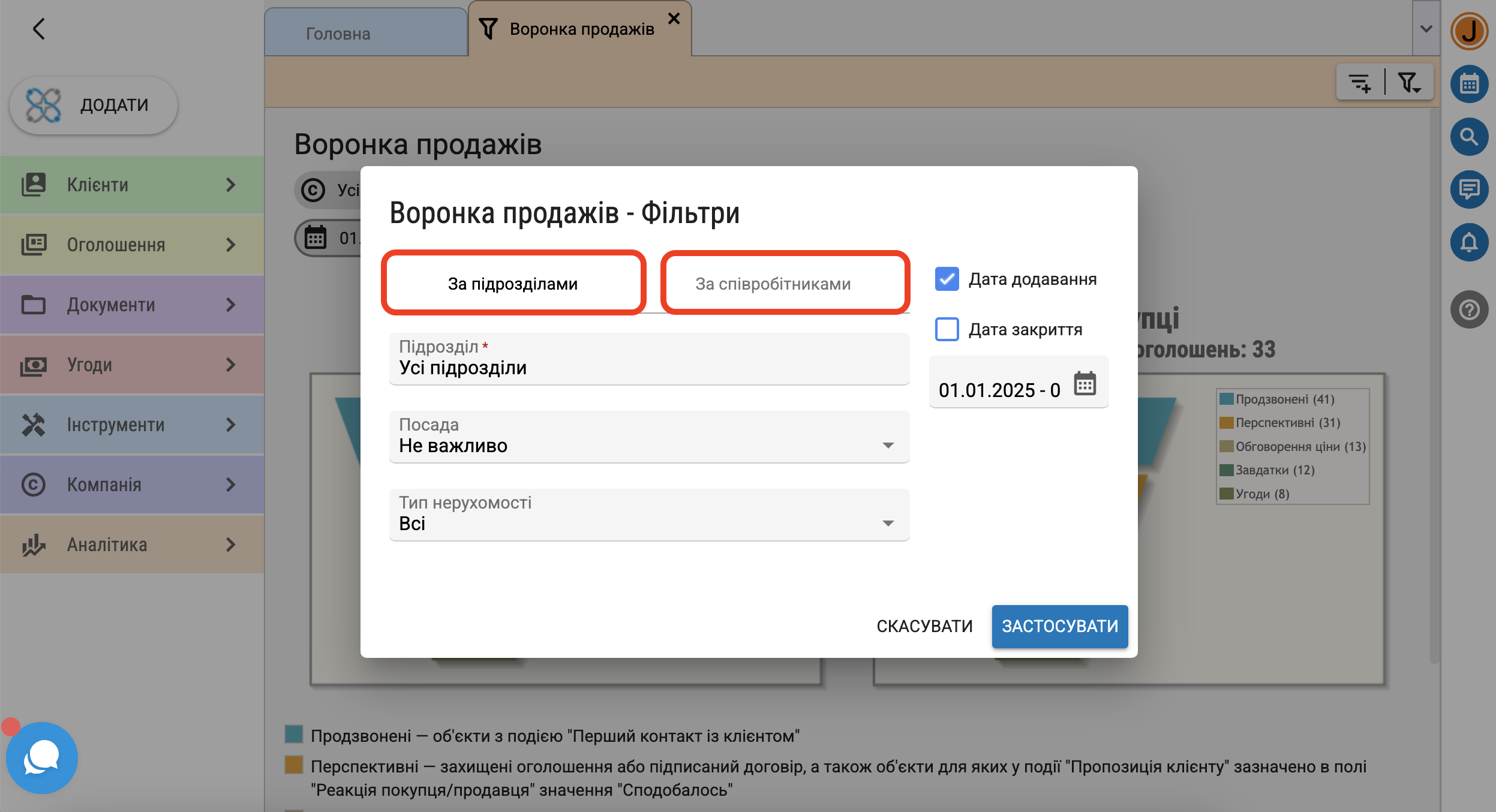 У відкритому вікні "Воронка продажів - Фільтри" можна виконувати пошук за підрозділами або за співробітниками. А також змінювати тип нерухомості та період, за який потрібна аналітика.