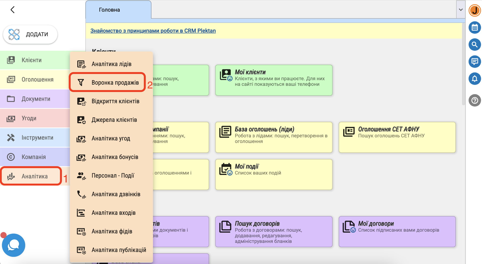 Для переходу до "Воронки продажів" натисніть в меню "Аналітика" - "Воронка продажів".