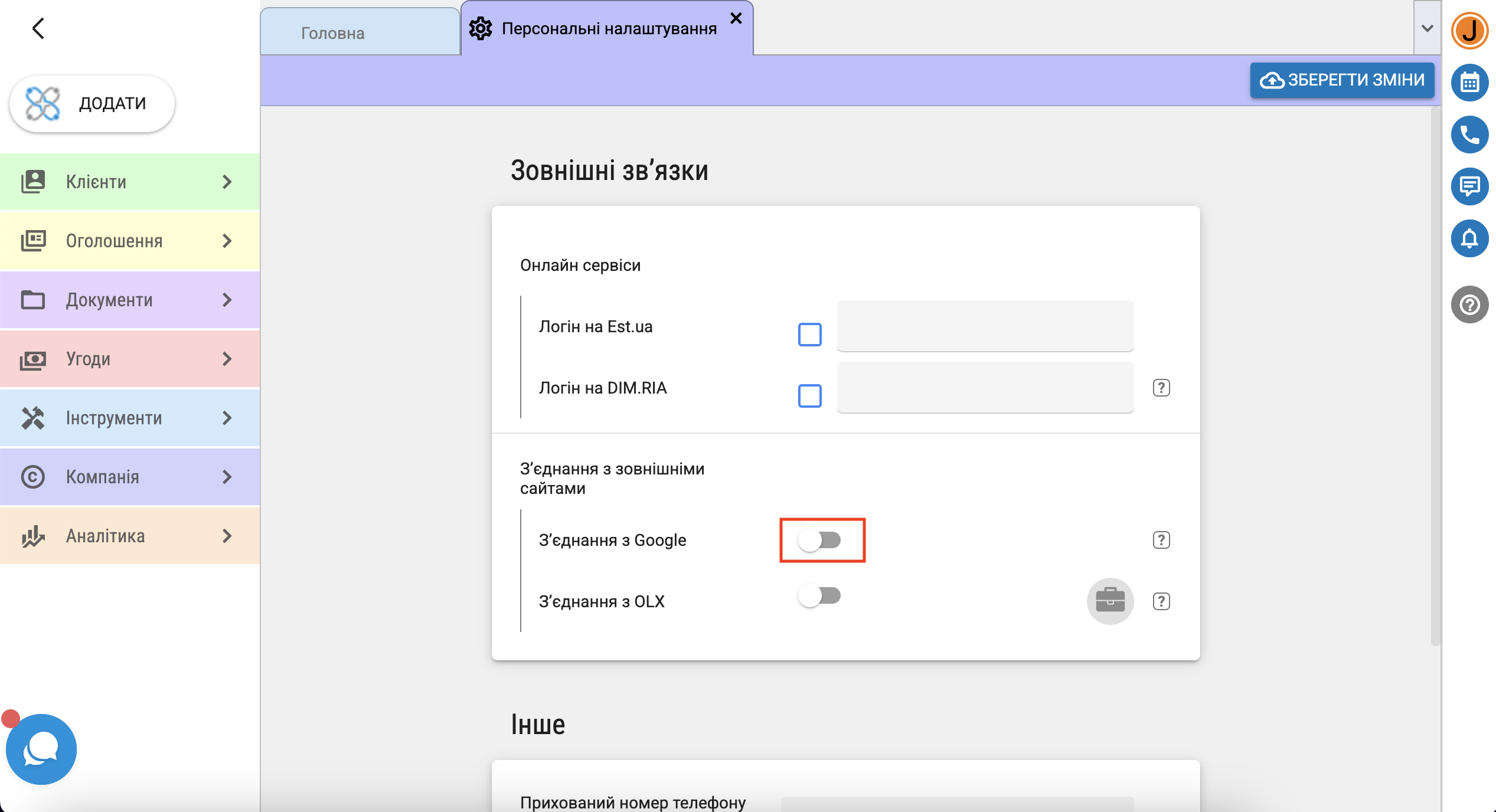 На відкритій сторінці "Зовнішні зв'язки" в розділі "З’єднання з зовнішніми сайтами" біля "З’єднання з Google" натисніть сірий перемикач.