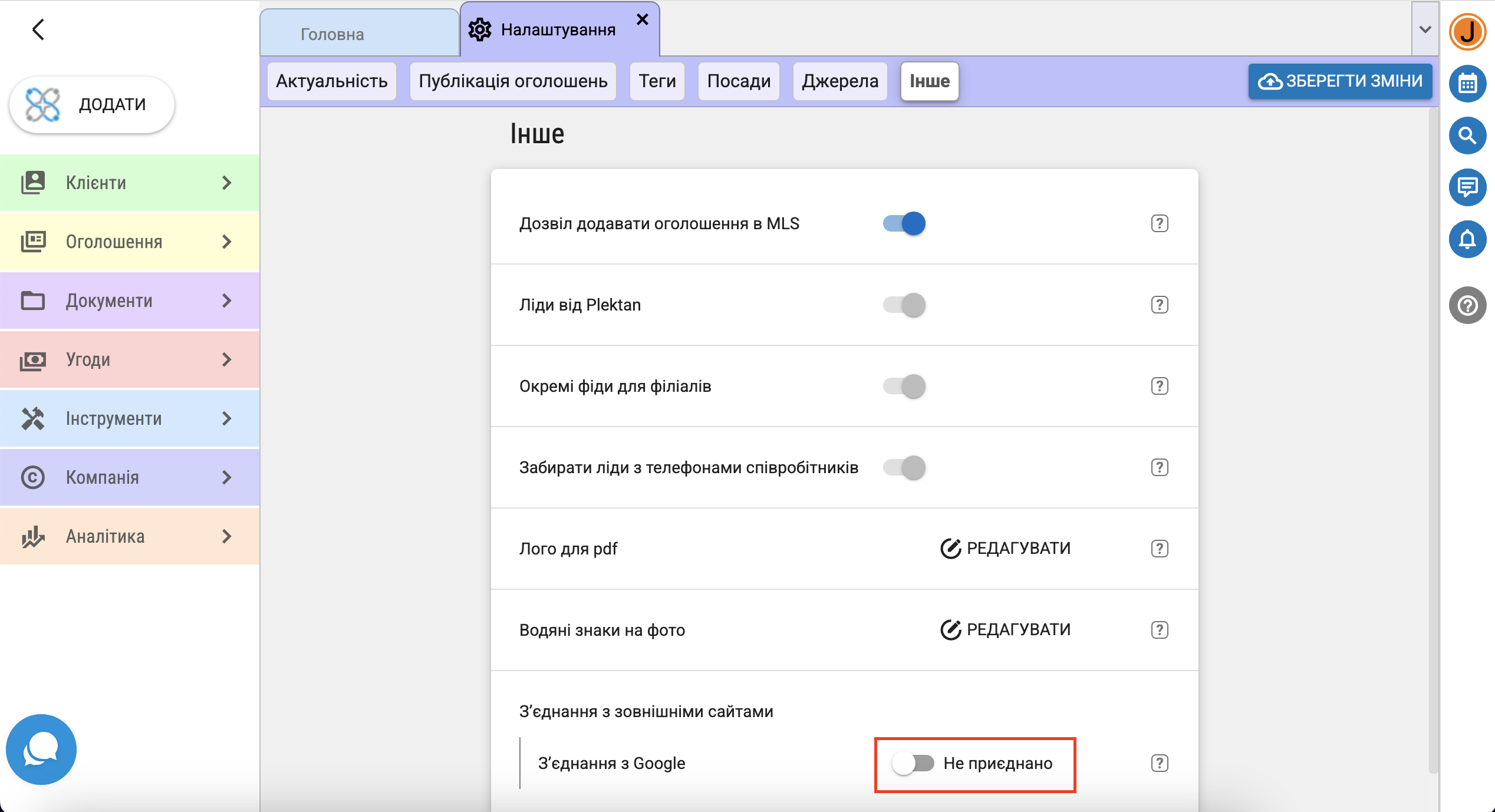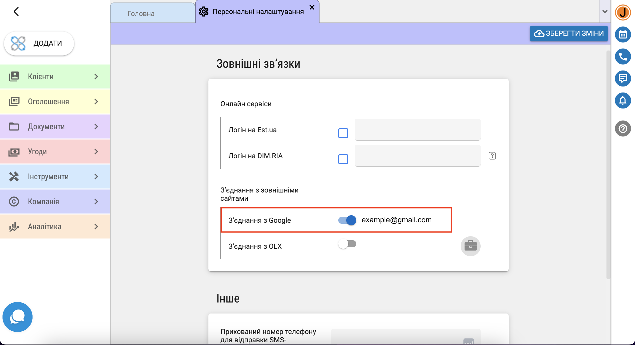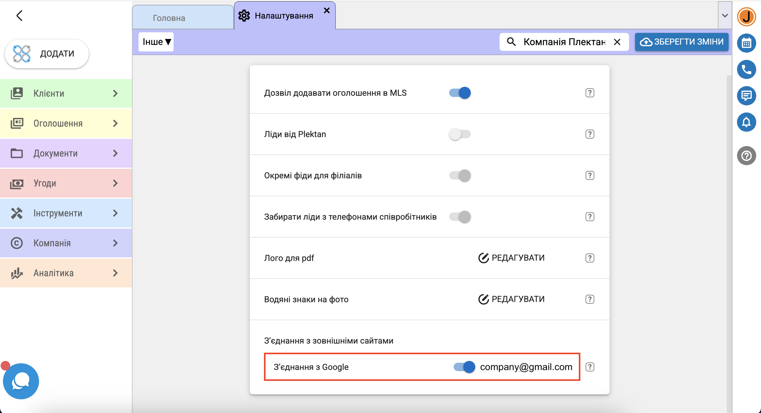 Якщо GMail-акаунт компанії підключено, то він буде відображатися біля перемикача "З’єднання з Google". А сам перемикач стане синього кольору.