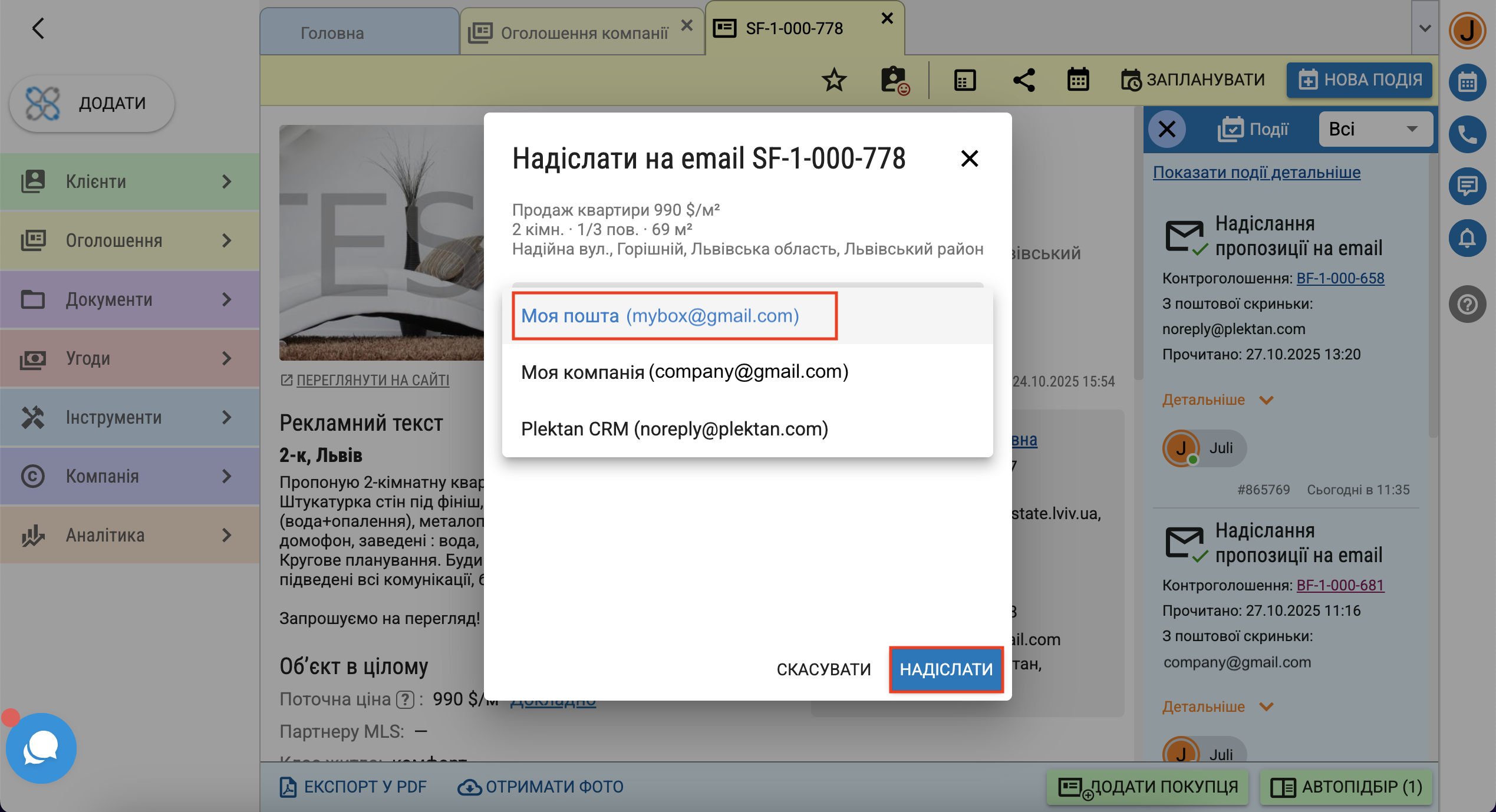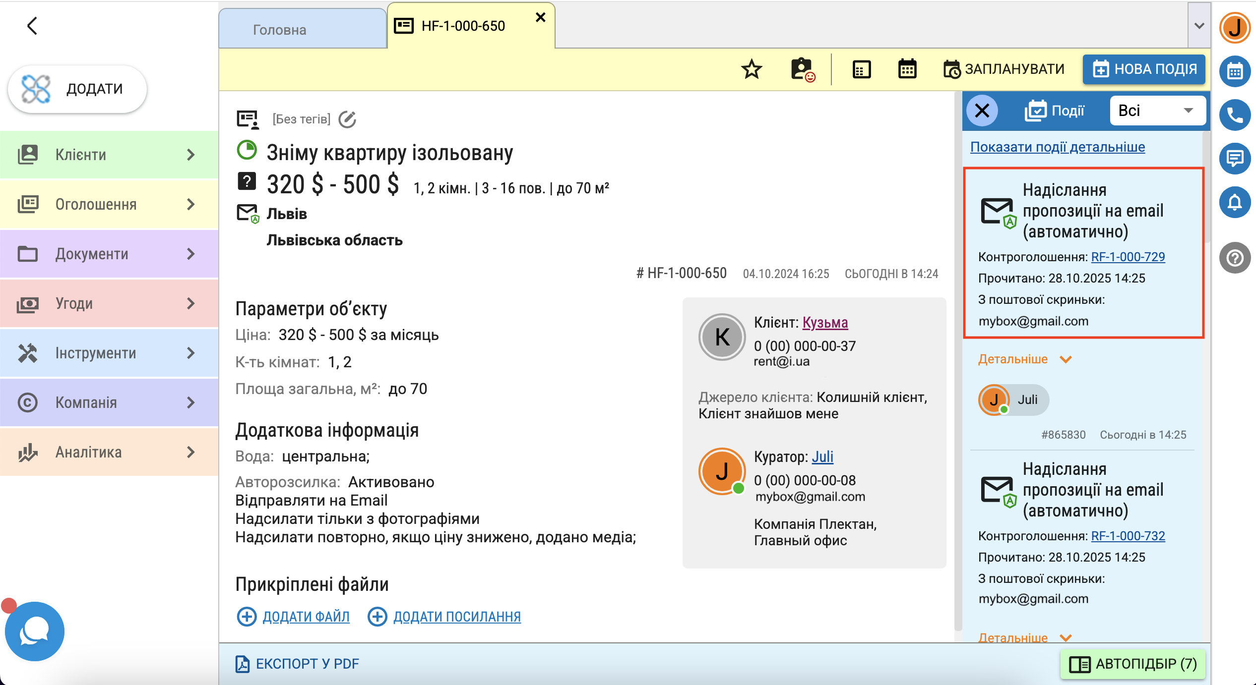 Пропозиції клієнтам в CRM Plektan можна відправляти в ручному режимі або підключивши автосповіщення про нові контрпропозиції на Email.