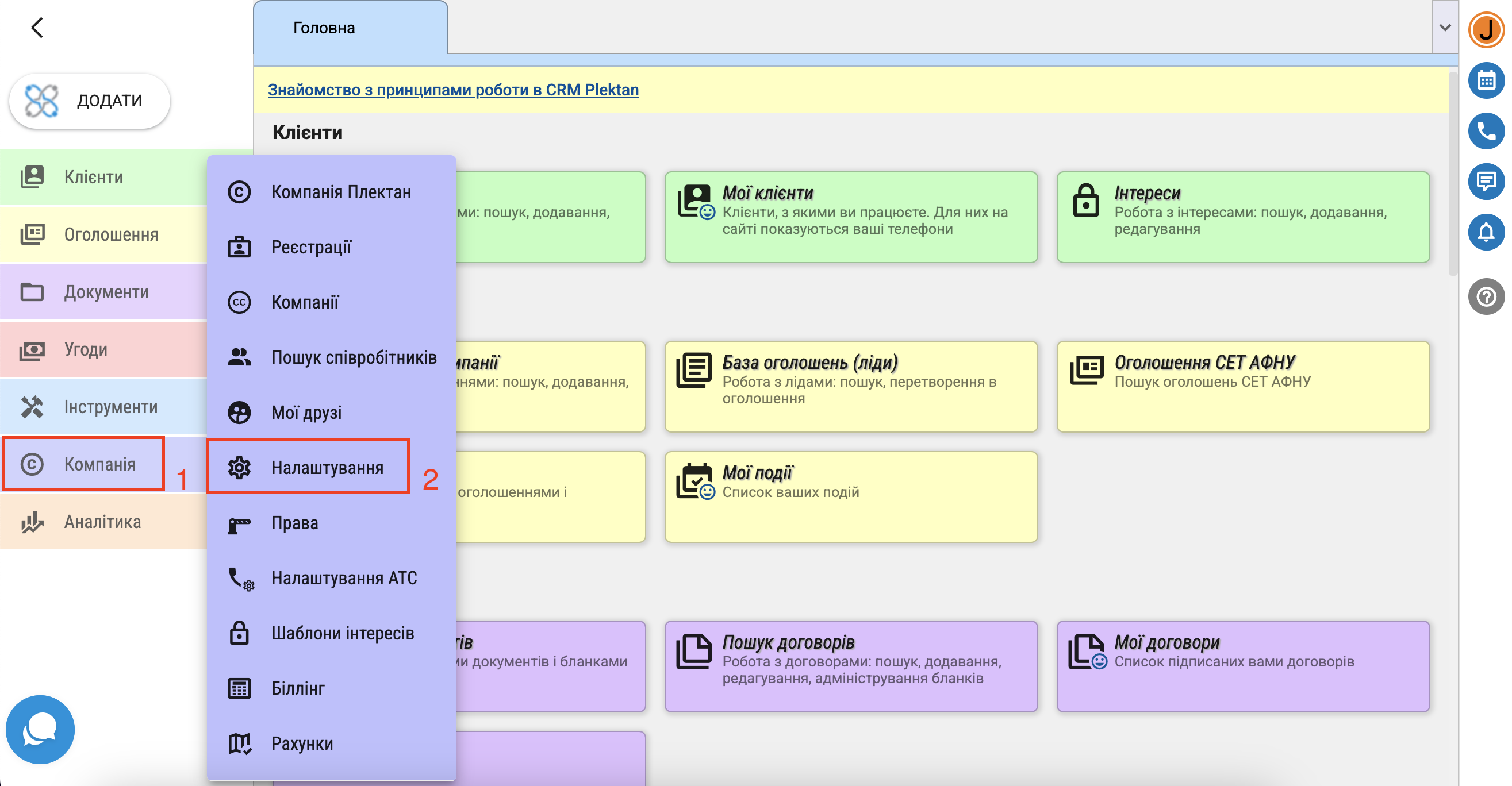Для підключення GMail-акаунта компанії в кабінеті директора, або співробітника з відповідними правами перейдіть в Меню до модуля "Компанія" - "Налаштування".