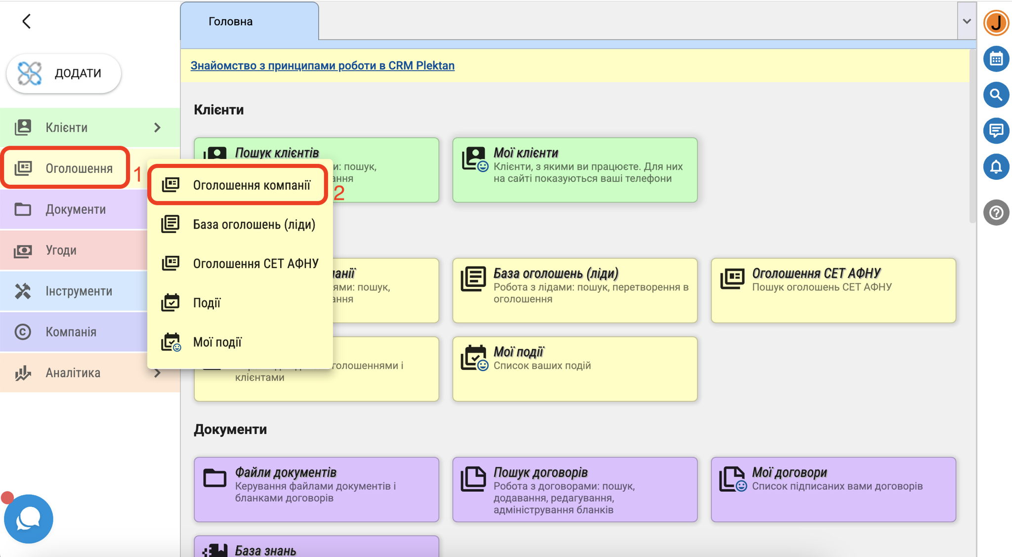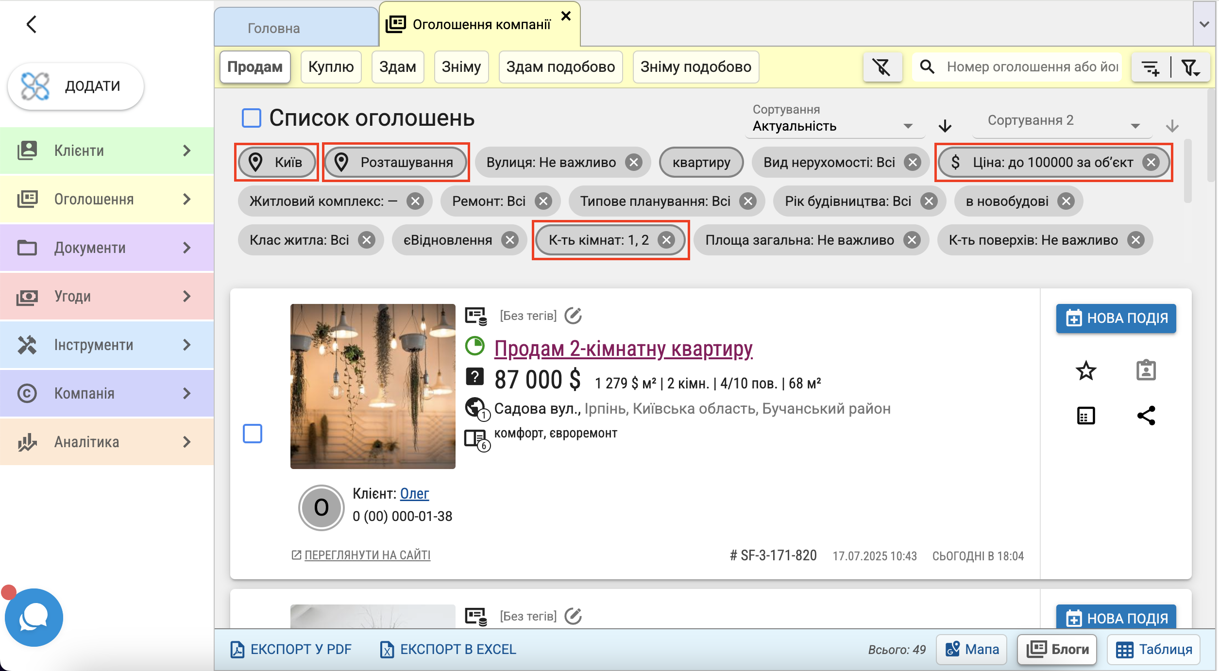 Всі оголошення, додані до системи в будь-який спосіб (вручну, за допомогою Розширення, оброблені з Лідів, ...) знаходяться в модулі "Оголошення". Щоб знайти певні з них, потрібно в даному модулі вибрати "Оголошення компанії".